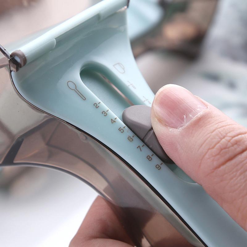 *The adjustable measuring cup set combines tbsp/tsp, ml, oz, cup to meet all your kitchen needs.*Measuring range is 5ml – 130ml, 2.8oz – 4oz, 1/8 cup – 1/2 cup to meet all your cooking and baking needs.The measuring spoon is made of high-quality food-grade material, BPA-free and is durable so you don't need to worry about rusting or bending. It can be used for dry and wet ingredients, such as easy seasoning, sugar, salt, oil, coffee, and more.It comes with a hanging hole on the back and a solid magnet at the bottom, the measuring spoon set can be hung on any hook, or placed on a metal surface such as a refrigerator to save space in the kitchen.Each measuring cup and spoon is clearly marked with a volume and ml measurement on the handle for quick identification and accuracy.There are no sharp and rough edges of the measuring set, keeping your hands safe during hand washing. It is also dishwasher safe for your convenience.*Package Inclusion:** 1 x Measuring Cup* 1 x Measuring Spoon*Product Specification:** Colour: Grey and Green* Material: ABS* Size: Cup- 7 × 18 × 6 cm, Spoon- 4.5 × 16 × 4 cm* Weight: 200g* Function: Measuring Spoon