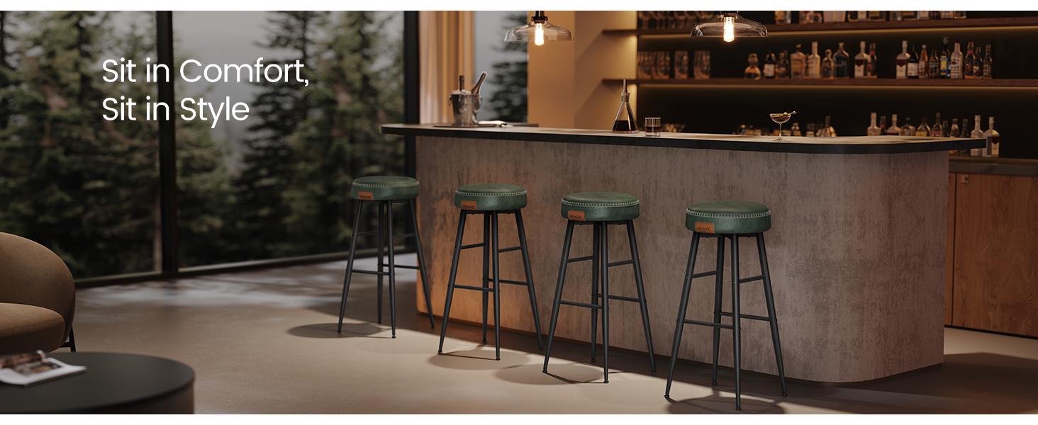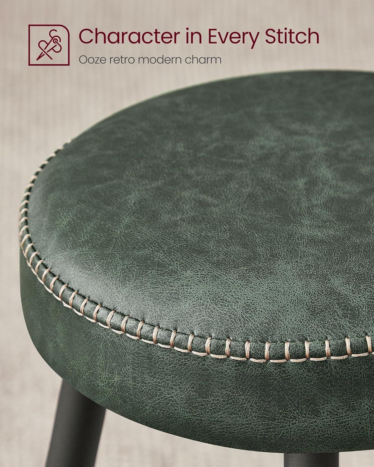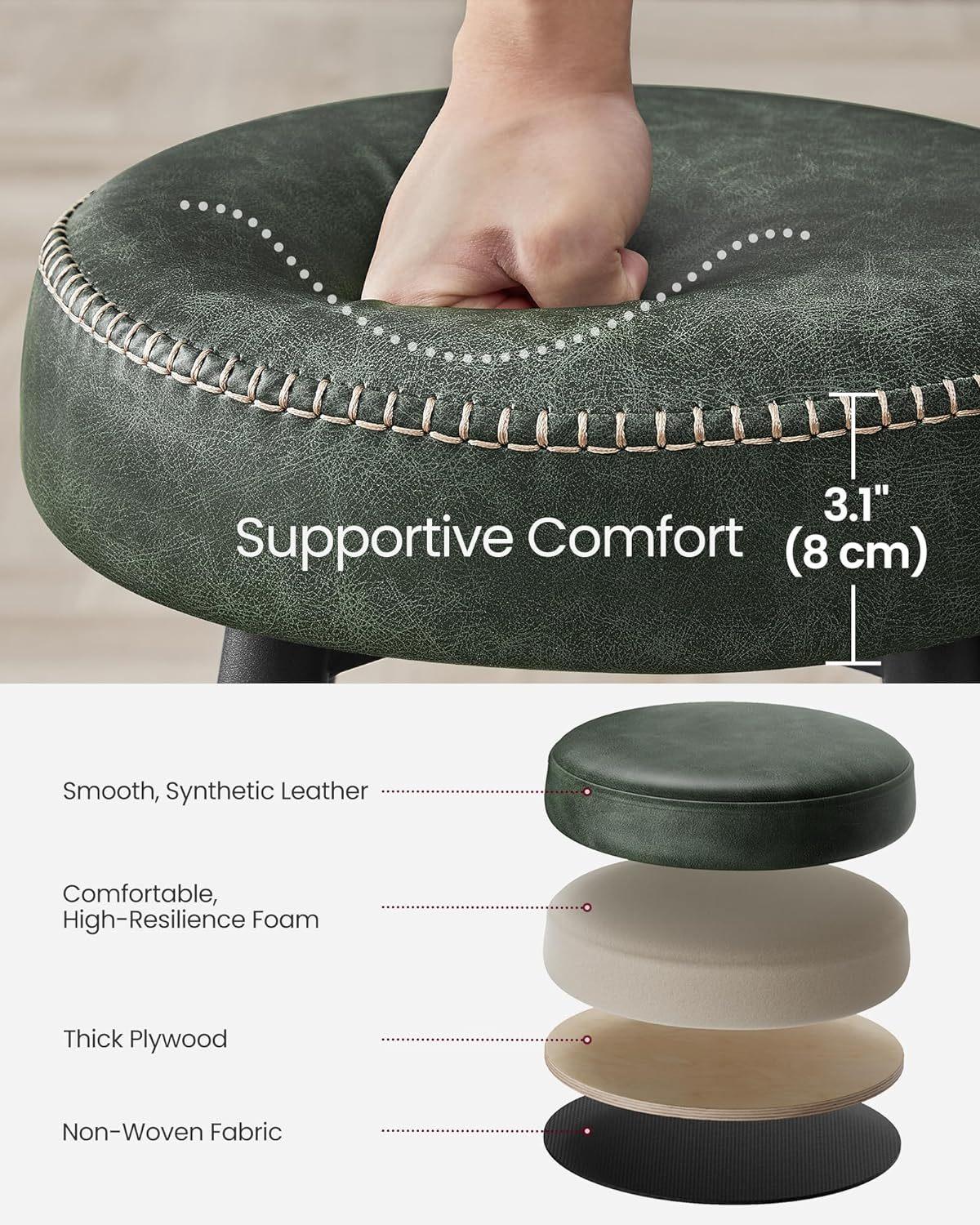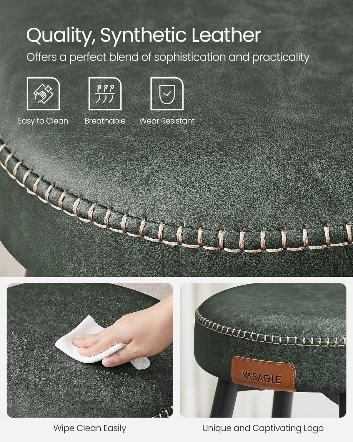 *_VASAGLE Ekho Collection Bar Stools Set of 2 – Forest Green_** Enhance Your SpaceWitness the alluring blend of synthetic leather, refined stitching, and sleek tapered legs in these bar stools from the Ekho Collection, a tangible homage to the spirit of crafts, elevating your home to new heights of sophistication* Comfort at Every SitGlide your hand over the smooth cover, then ease into the supportive luxury of the 3.1" thick, high-resilience foam. These bar stools provide a comfortable seating experience that endures, standing the test of time* Adaptable EleganceThis set of 2 bar stools, featuring unique staggered footrests, is the ultimate game-changer. They effortlessly accommodate friends of all heights, offering an unmatched blend of comfort and versatility* Steadfast Stability, Gentle on FloorsWith swivel leveling feet, these kitchen stools ensure stability on uneven surfaces and gentle, scratch-free contact, instilling peace of mind for quiet drinks or lively parties* Effortlessly Clean and ChicOccasional spills? No worries! The water-resistant, synthetic leather cover can be wiped clean in a snap. The matte steel legs resist scratches, maintaining their sophisticated allure even with everyday use*Specifications** Color: Forest Green* Material: Steel, High-Resilience Foam, PU (Polyurethane) Leather, Plywood* Product Size: 20.3”D x 20.3”W x 30”H (51.6 × 51.6 × 76.2 cm)* Total Weight: 16.8 lb (7.6 kg)* Max. Static Load Capacity per Stool: 265 lb (120 kg)*Package Contents** 2 x Bar Stool* 1 x Accessory Kit* 1 x Instructions