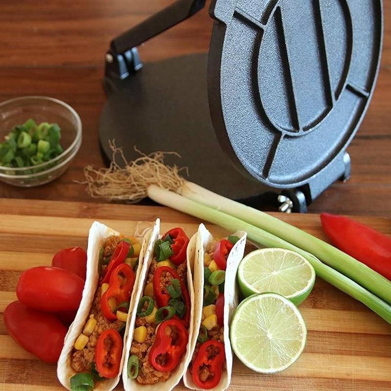 *COOKOZZY Cast Iron Tortilla Press**Discover the authentic flavours of homemade tortillas*Crafted from high-quality cast iron, this tortilla maker is built to deliver exceptional performance and durability, ensuring delicious results every time.*Textured engineered surface*This cast iron press is specially designed for better seasoning retention, surpassing smoothed pans while preserving the unique pebbly feel. This feature enhances the cooking process and adds a distinct touch to your tortillas.*Engineered with the user's comfort in mind*This professional tortilla press features a reinforced design with engineered flat plates that prevent pinching. The ergonomic curved pressing handle offers better resistance and effortless operation, allowing you to create perfectly flattened tortillas with minimal effort.*Versatile in function*This press is not limited to tortillas alone. Use it to make homemade flour, corn, gluten-free, paleo, and wheat tortillas, or explore other culinary possibilities such as quesadillas, empanadas, or roti's.*Experience optimal performance*The weighted sides and handle configuration provide maximum leverage without pinching, ensuring consistent and effortless flattening of the dough every time.*Technical Specifications*Colour: BlackMaterial: IronSize: 47×19.5×2.5cmWeight: 3.05kgPackage Contents:1 x COOKOZZY Cast Iron Tortilla Press
