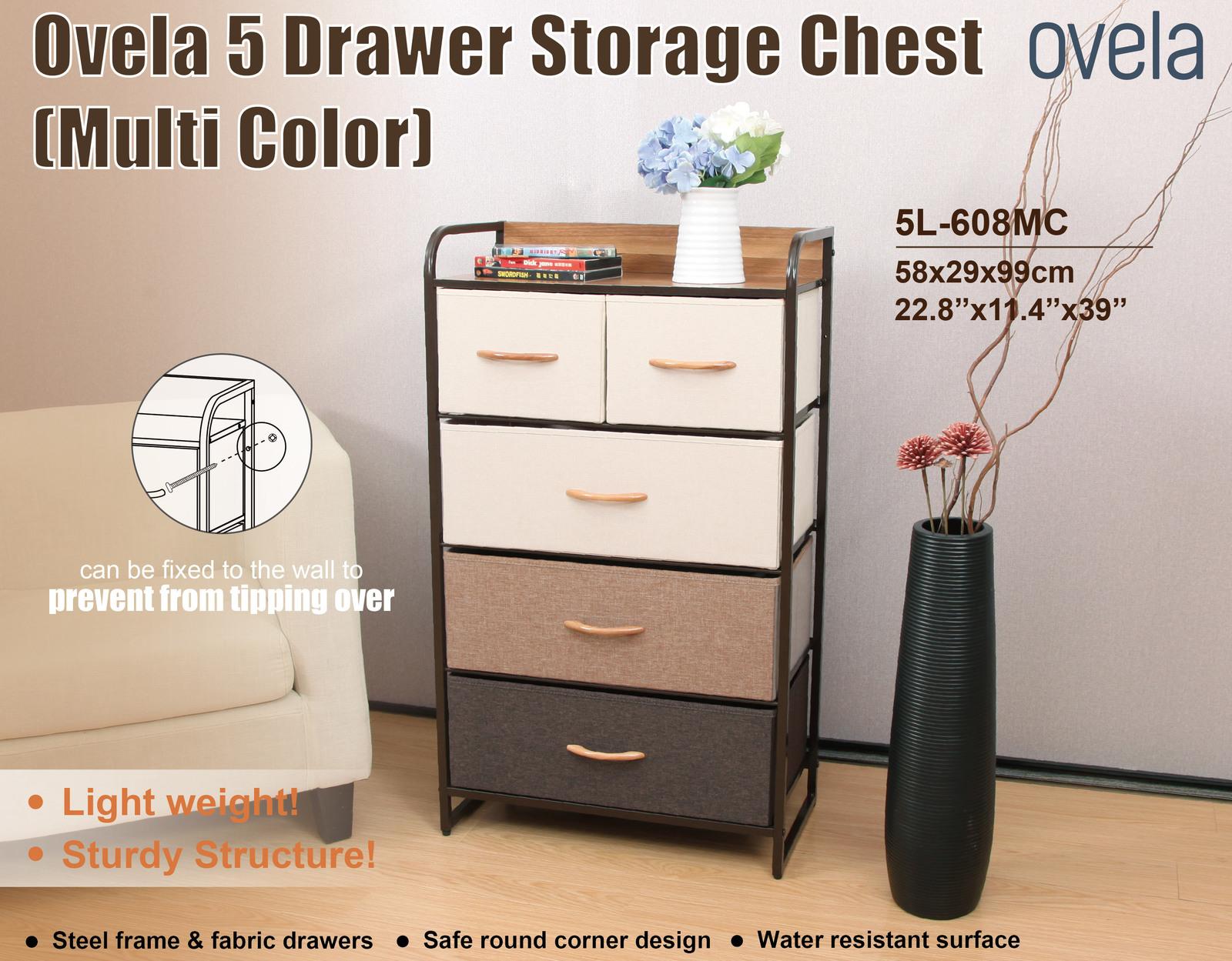 Hide away household clutter with this handy storage chest that offers ample space to store everything from documents, cords and stationary to other belongings for a neat and tidy home.* Contemporary storage chest* 5 Spacious drawers* Solid surface tabletop* Lightweight and easy to move* Sturdy structure* Easy to assembleGive your home interior an instant update thanks to the _Ovela 5 Drawer Storage Chest Multi Color_ that holds everyday essentials and other common household items with modern style.*Space For Storage*From clothing and accessories to paperwork and cables, the five pull-out drawers are perfect for packing away any household items to maximise space anywhere around the house and keep it neat and organised. The solid wood top of this chest of drawers can also hold things like lamps, books, phones, and chargers for you.*High-Quality Material*Strong alloy steel frame and solid MDF top that make the whole dresser sturdy and stable, the non-woven drawer with arc handle is soft on opening and closing, and cleaning is easy to clean directly with a damp cloth. Adjustable legs with plastic cover to protect your floor.*Simple Style Update*The simple silhouette is paired with a neutral colour palette that complements existing decor while bringing a touch of contemporary charm to the interior of any home.*Wall-mountable for safety*Prevents tipping and enhances stability.*Specifications:** *Dimensions:* 58 × 28 x99cm* *Weight:* 10kg* *Colour:* Multi Color* *Weight Capacity:* Top: 20kg, Drawer: 3kg*WARNING**Children have died from furniture toppling over*1. always secure this furniture with an anchor device.2. never allow children to stand, climb or hang on drawers, doors, or shelves.3. never open more than one drawer at a time.4. place heavy items down low.5. never place a television on this furniture.