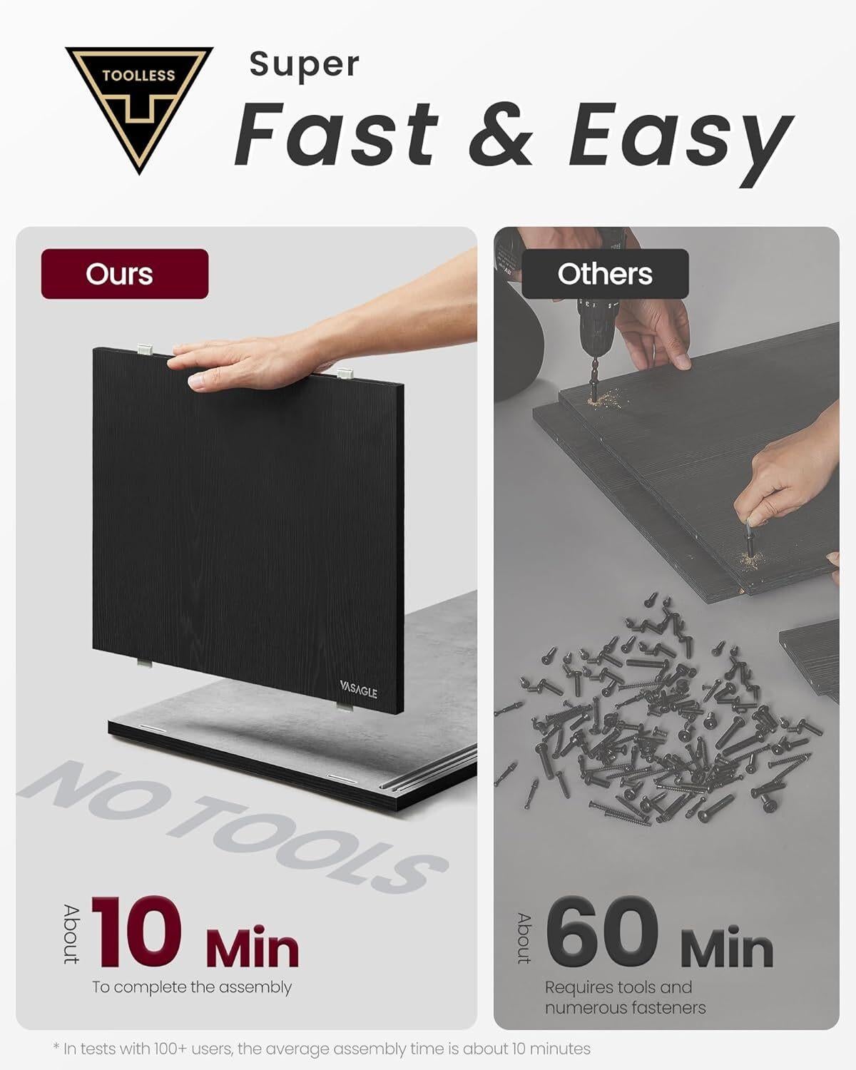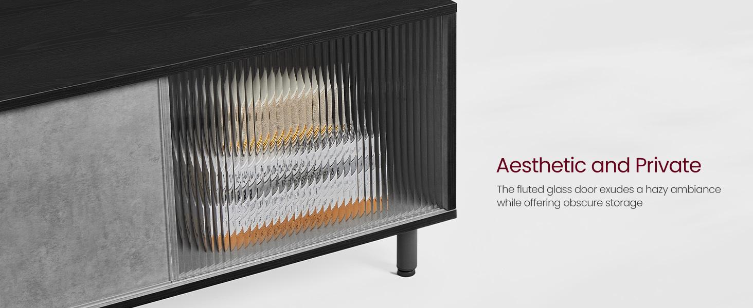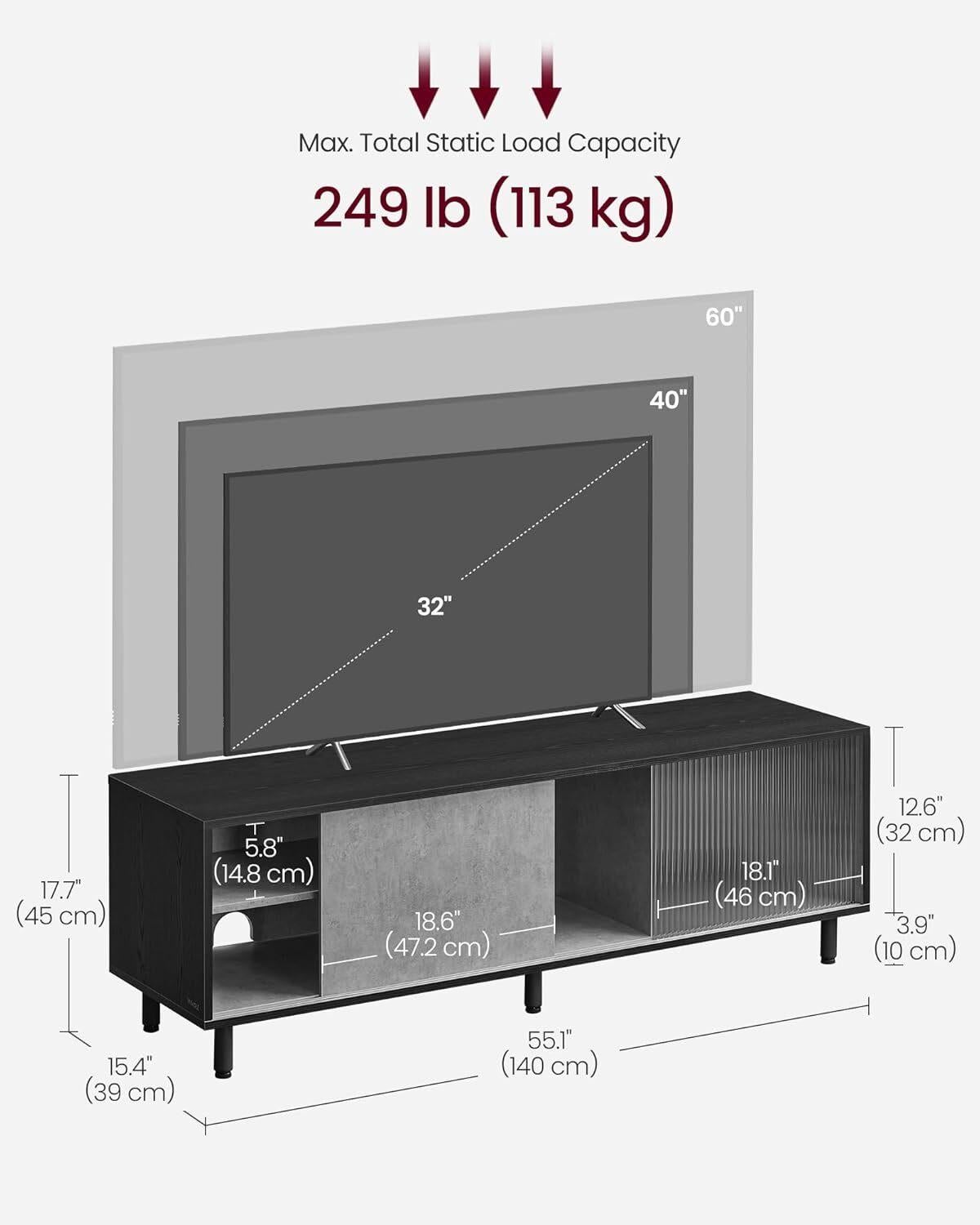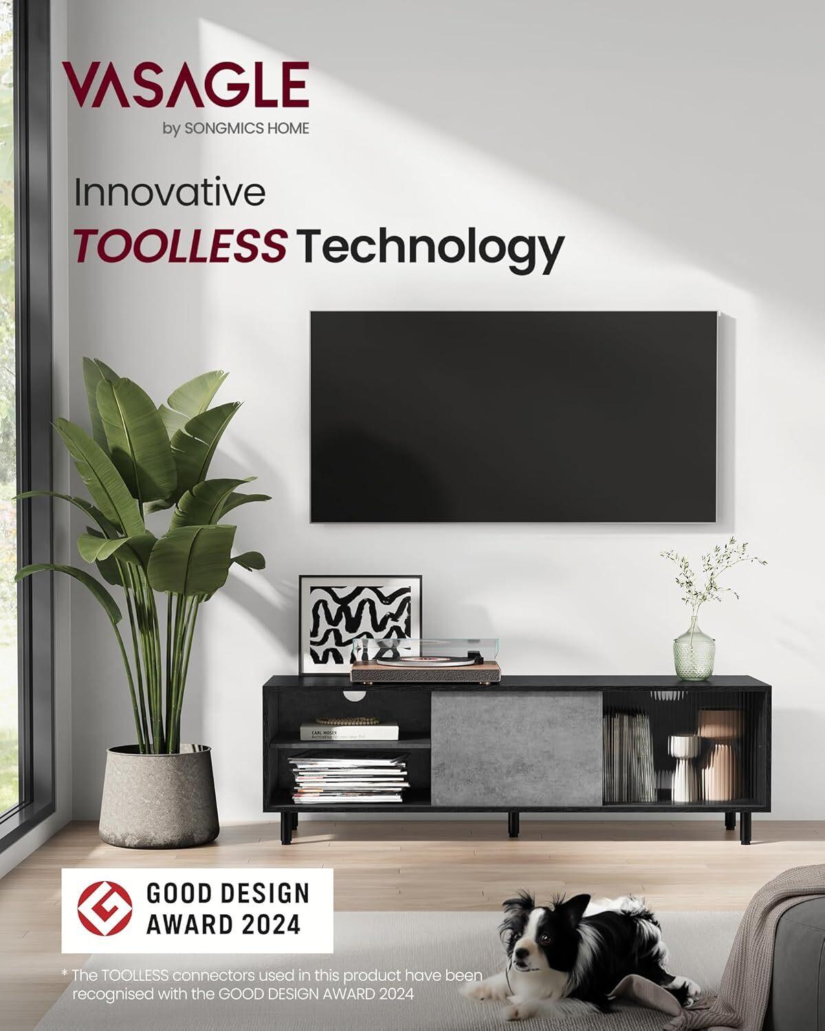 *_VASAGLE Superfast Toolless 1.40M TV Stand Cabinet – Cloud White and Concrete Grey_** *SUPERFAST, TOOLLESS ASSEMBLY*Set up this TV stand in about 10 minutes—no tools required. Recognised the GOOD DESIGN AWARD 2024, the connectors allow the panels to simply snap together. No more tedious assembly and countless fasteners!* *RELIABLE STURDINESS*Engineered with a secure interlocked system and crafted from quality particleboard and steel legs, this TV cabinet boasts superior structural sturdiness and unwavering stability, holding up to 60 kg on the tabletop and 113 kg in total* *INVITES MODERN LIVING*Modern style meets relaxed living with this TV unit. The dual tones of cloud white and concrete grey introduce a chic, modern vibe, while the fluted glass exudes a soft, hazy ambiance, creating an inviting entertainment space* *SPACIOUS AND ADJUSTABLE*The sliding doors let you show or hide media essentials as desired, while the fluted glass provides obscure storage for aesthetic and privacy. The middle shelf can be placed in any of the 3 sections according to your preference* *FITS TVS UP TO 60"*Measuring 140 × 39 × 45 cm, this entertainment centre accommodates TVs from 32", 45", 50", 55", up to 60", making it a versatile addition to your entertainment area or media room*Specifications** Material: Engineered Wood, Alloy Steel* Product Dimensions: 140 × 39 × 45 cm; 21.7 kg* Color: Ebony Black & Concrete Grey