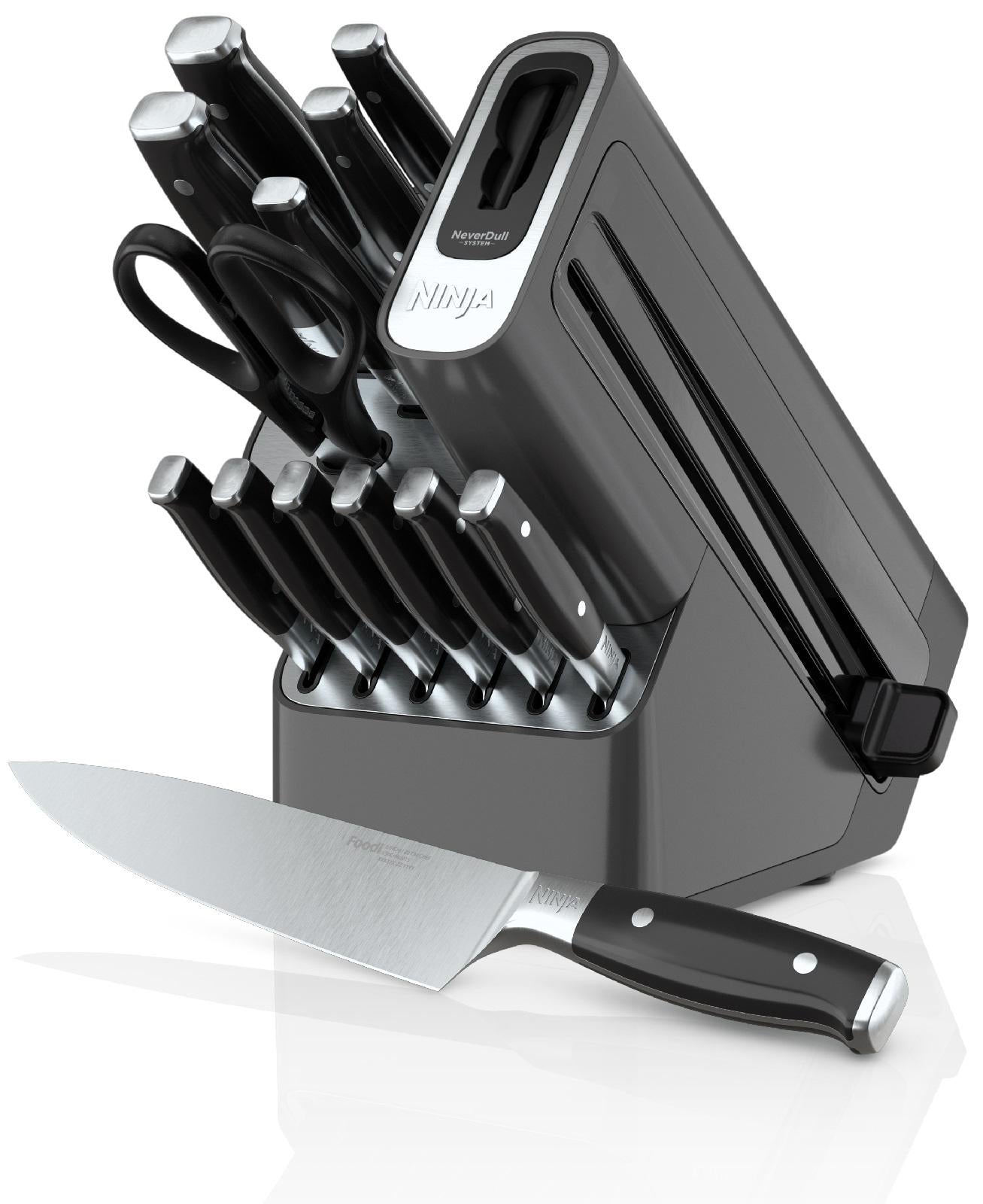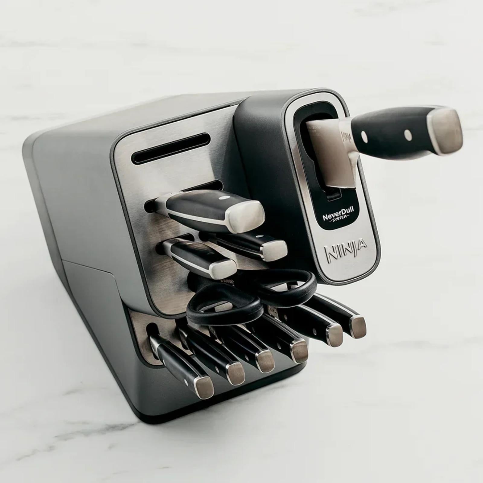 Introducing the Ninja Foodi NeverDull Premium Knife System, the premium knives that stay razor-sharp for over 10 years. This versatile set includes 12 knives with forged German stainless-steel blades that are durable and perfectly balanced for comfort and control.*Features:** German Stainless-Steel Blades – This versatile 13 piece set features forged German stainless-steel blades that are durable and perfectly balanced for comfort and control.* Foolproof Sharpening with NeverDull Technology – With only a few swipes of the built-in, foolproof sharpener, this all-in-one system maintains the superior sharp edge you crave use-after-use.* Precision Sharp – Easily glide through tough ingredients with a razor-sharp cutting edge with every use.* Foolproof Sharpening with NeverDull Technology – Convenient built-in sharpener easily delivers professional results in seconds. Just lock in Ninja's exclusive blade and swipe the lever on the outside of the block a couple of times to maintain a razor-sharp edge.* The NeverDull Dynamic Stone Sharpening Wheel – The NeverDull Dynamic Stone Sharpening Wheel within the block easily maintains razor sharp edges on your knives by consistently engaging the full length of the blade at the perfect angle and applies optimal pressure to restore your blade to superior sharpness.* The Ergonomic Handle – The ergonomic handle is perfectly balanced for comfort and control.* Suction Base – Suction feet on the base of the storage block firmly and securely fastens to your bench.\*\* What's in the Box\*\** 8" Chef Knife,* 8" Bread Knife,* 5" Santoku Knife,* 5" Boning Knife,* 5" Utility Knife,* 3.5" Paring Knife,* 6 × 4.5" Steak Knives,* Kitchen Shears,* Knife Block with Sharpener*Specifications** Colour: Stainless Steel and Black* Dimensions (cm): H=32.5 cm, W=15 cm, L=36 cm* Weight (kg): 3.14 kg\*_With all included knives installed in the knife block_* NeverDull Technology* Perfectly Balanced* German Stainless-steel Blades