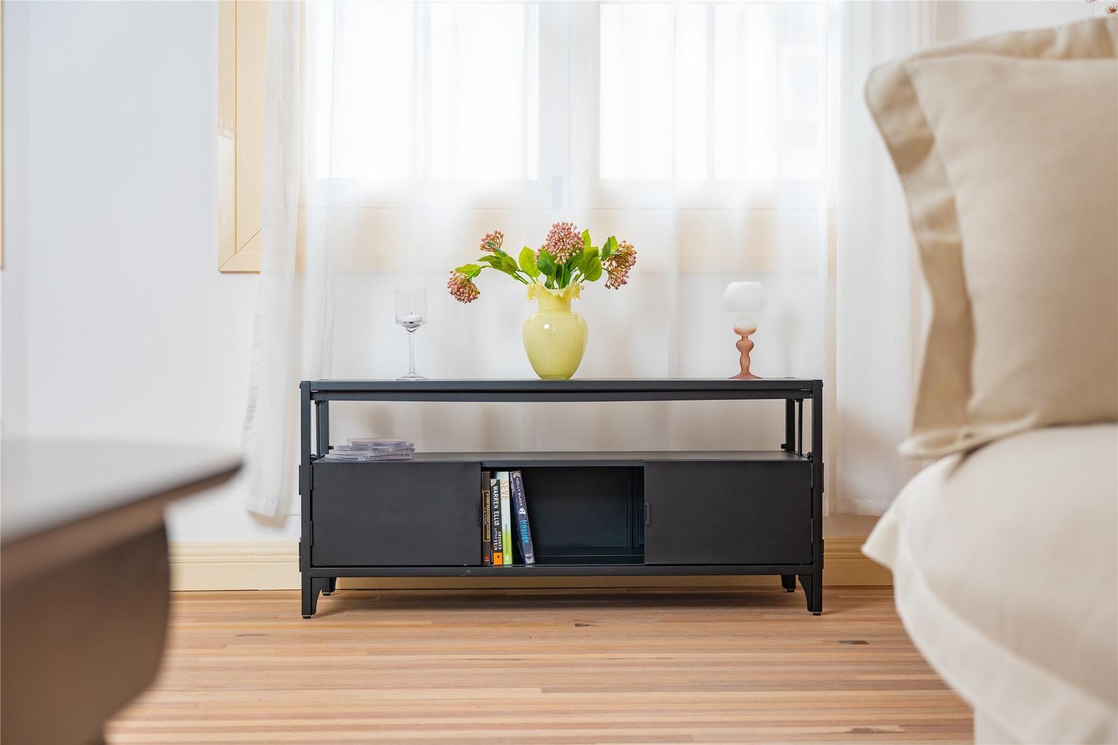 *_Fraser Country Metal Faster Setup Foldable Double Door TV Cabinet – Black_*The Fraser Country Metal Faster Setup Foldable Double Door TV Cabinet is a versatile piece of furniture that can serve multiple purposes in your home. Here’s a detailed overview of its features and potential uses:*Features** Constructed from durable metal, ensuring longevity and sturdiness.* Foldable design allows for easy setup and storage, making it convenient for various spaces and uses.* Doors double swing door design provides easy access to the interior.* Versatility although primarily designed as a TV cabinet, it can be used in different parts of the home due to its multi-purpose nature.*Uses**TV Cabinet** Living room perfect for holding a TV, with additional storage space for media devices, DVDs, or gaming consoles.*Kitchen Cabinet** Pantry storage great for storing non-perishable food items, kitchen gadgets, or cookware.* Additional counter space can be used to hold small appliances like a microwave, toaster, or coffee maker, freeing up counter space.*Multi-Purpose Use** Office use it as storage for office supplies, documents, or even as a printer stand.* Garage ideal for organizing tools, gardening supplies, or other miscellaneous items.* Kids’ room can be used for toy storage, books, or school supplies.* *Spacious and Organized:*Offers ample shelf space above and concealed storage below with double doors, ensuring your media essentials are both accessible and neatly arranged.* *Durable Construction:*Crafted from high-quality metal for long-lasting use and stability, providing a reliable foundation for your television and media devices.* *Foldable for Flexibility:*Ingeniously designed to fold flat, this cabinet is ideal for homes where space is at a premium, allowing easy storage when not in use.* *Elegant Style:*The clean lines and minimalistic white finish complement any room décor, from modern to traditional, enhancing the overall aesthetic of your space.This cabinet is not only a practical piece but also a statement in design, providing a touch of elegance while catering to your organizational needs.*Specifications** Material: Metal* Dimensions: W1100 x H500 x D350mm* Internal Dimensions Rack 1055 × 150 × 330mm* Internal Dimensions 3 Storage Section W340 x D330 × 205mm* Color: Black* Maximum Weight Limit 80kg* Warranty: 2 Year