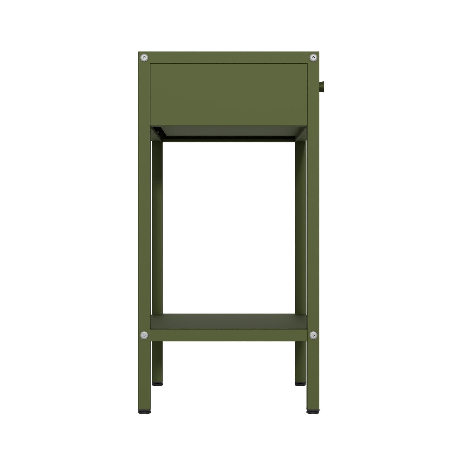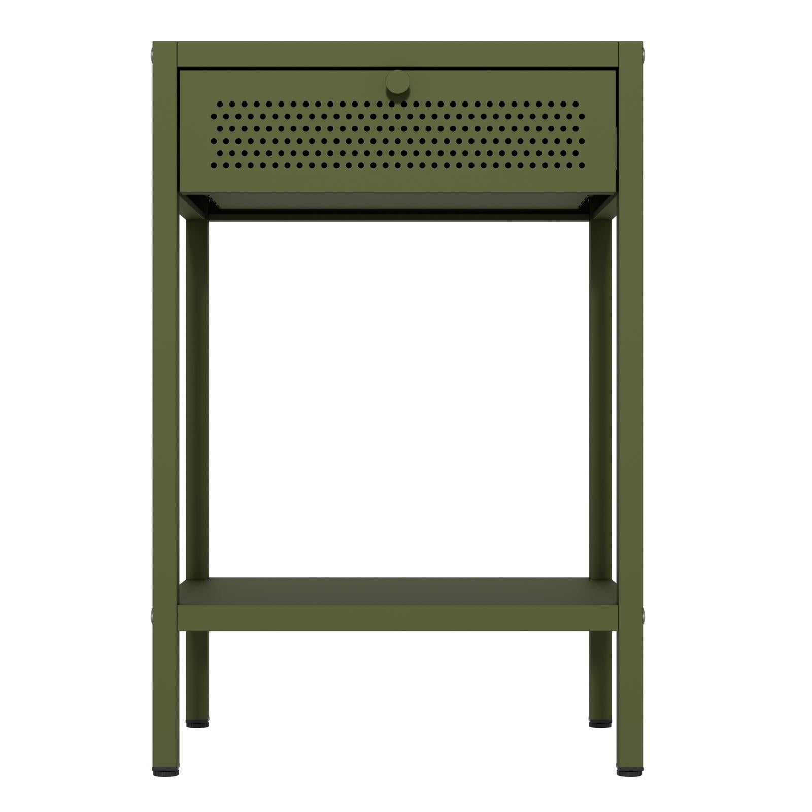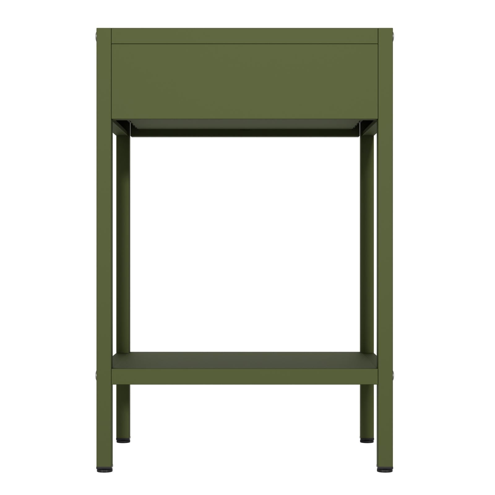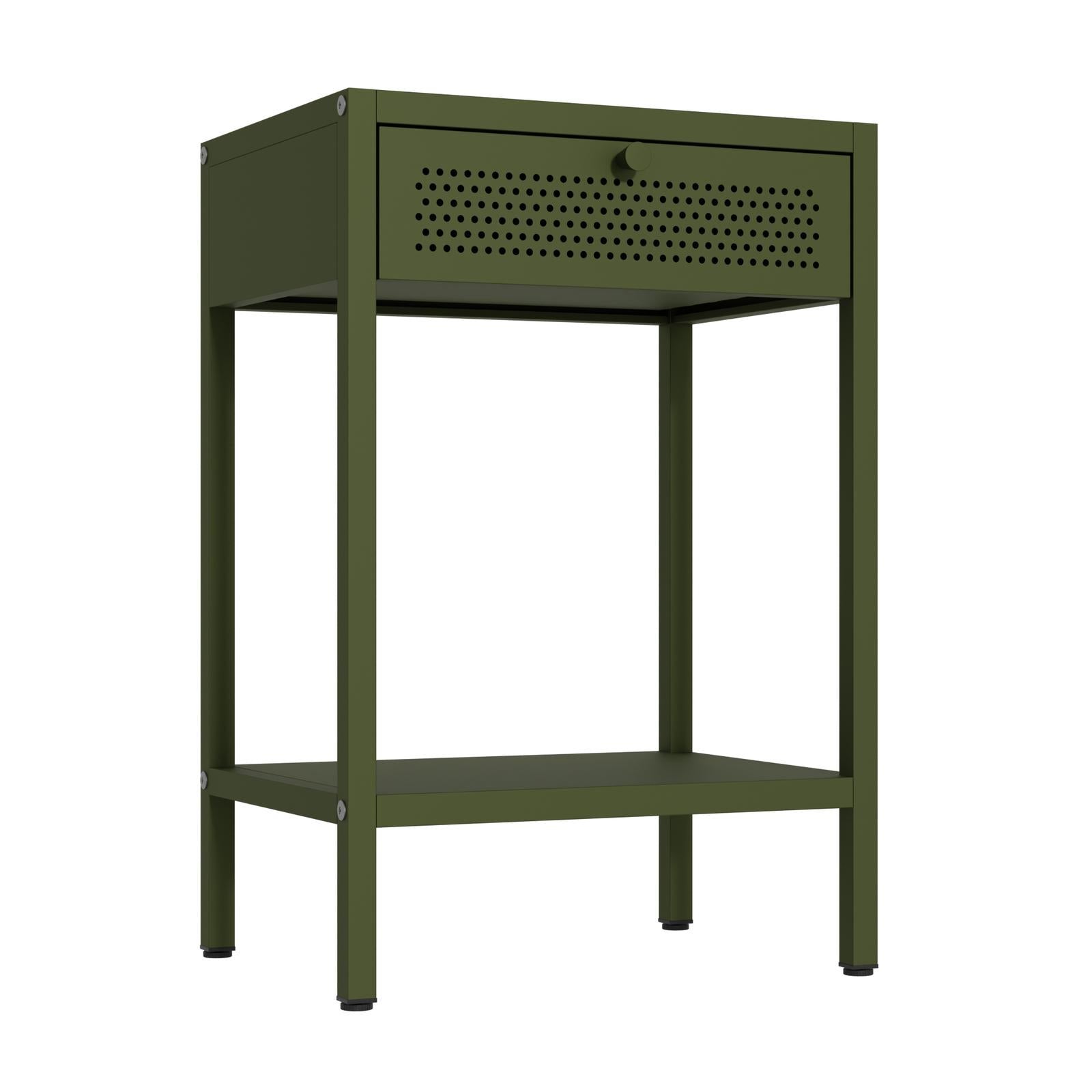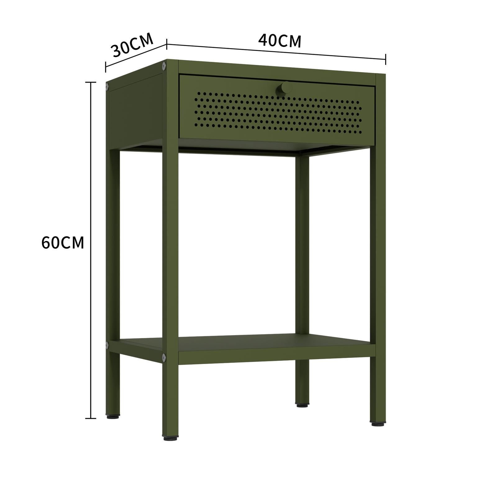 *_Fraser Country – Milan Metal Bedside Cabinet – Olive Green_*The Fraser Country Milan Metal Cabinet merges style with practicality, making it a perfect fit for any home or living space. With its robust build and versatile design, this bedside cabinet offers both convenience and security. The straightforward assembly process and high-quality materials ensure it will be a durable addition to your home.The Milan Cabinet isn't just for bedrooms – it also makes a fantastic side table for living rooms, offices, and other spaces. Its sleek design and practical features allow it to serve as a stylish and functional side table, perfect for:* *Living Room*: Use it to hold lamps, books, and decorative items next to your sofa or armchair.* *Office*: Keep it beside your desk for easy access to office supplies and personal items.*Features** *Adjustable Shelves*: Two adjustable shelves to accommodate various storage needs.* *Bottom Shelf*: Ensures the door remains securely shut yet easy to open.* *Handle*: Convenient handle on the outside for easy access.* *Drawer & Shelf*: The cabinet features a spacious drawer to tuck away essentials and a convenient bottom shelf for books, décor, or other frequently used items—combining style and practicality in one minimalist frame.*Metal Cabinet Assembly Recommendation** Assemble on a Soft Surface:* Use a carpet to avoid scratches during assembly.* Ensure no hard or small objects are on the surface.* Vacuum the carpet before assembly to remove any objects that could scratch the cabinet during assembly.*Door Alignment Adjustment** If the door are not aligned, adjust the height of the feet to balance the cabinet.*Specifications** *Material*: High-quality cold-rolled steel* *Thickness*: Finished δ=0.6+0.7+0.8mm* *Coating*: Epoxy powder coating* *Color*: Olive Green* *Product Dimensions*: W40cm x H60cm x D30cm (Width x Height x Depth)* *Knock Down Structure*: Designed for easy assembly.* *Secure Packaging*: Ensures safe delivery by protecting the cabinet during shipping.* *Warranty*: 2 Year