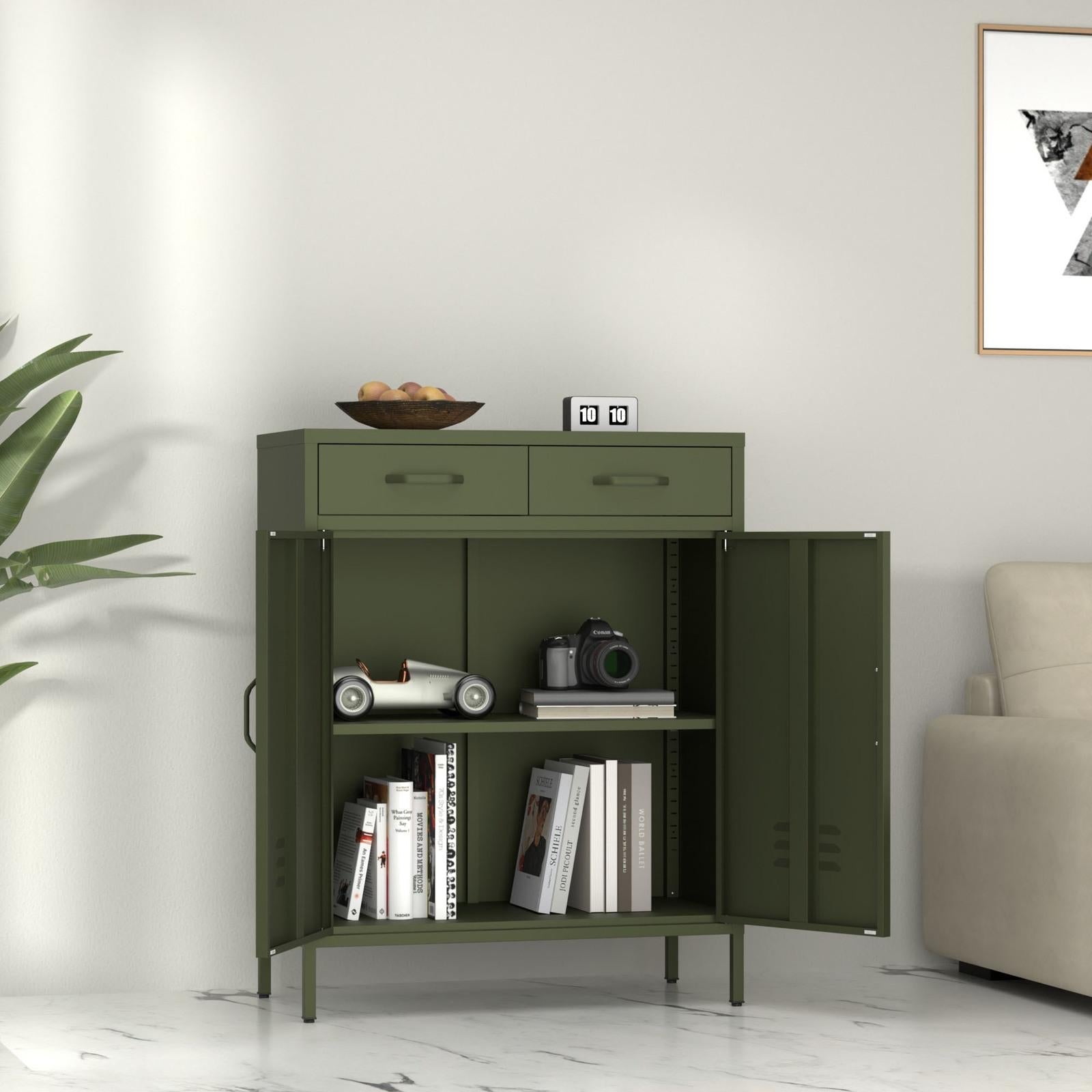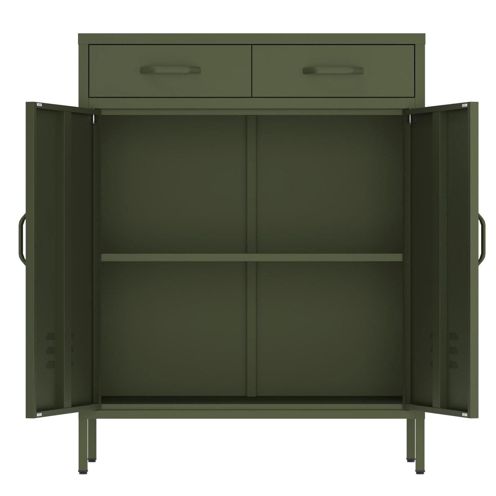 *_Fraser Country Milan Metal Cabinet With Drawers – Olive Green_*Bring a touch of contemporary style and functionality to your home with the *Fraser Country Milan Metal Cabinet With Drawers – Olive Green*. Perfectly blending modern aesthetics with practical design, this cabinet boasts a sleek olive-green finish that provides a fresh yet subtle pop of color to any room. Built for durability, this metal cabinet is ideal for adding extra storage to living rooms, bedrooms, home offices, or hallways.The two top drawers offer convenient storage for small items such as remote controls, documents, or accessories, while the spacious lower cabinet is designed to house larger items like books, kitchen supplies, or household essentials. The adjustable interior shelf provides flexibility, allowing you to organize your items with ease.*Features:** *Stylish Olive Green Finish*: The contemporary olive green color brings a modern and natural element to your decor, seamlessly blending into various interiors.* *Durable Metal Construction*: Made from high-quality metal, this cabinet is built to withstand everyday use while maintaining its sleek appearance.* *Ample Storage Space*: The two drawers provide easy access to smaller items, while the double-door cabinet below offers generous storage for bulkier belongings.* *Adjustable Shelving*: Inside the lower cabinet, adjustable shelves allow for customizable storage, accommodating items of various sizes.* *Ventilation Details*: The lower cabinet features subtle ventilation cut-outs, adding a unique design touch while promoting airflow.* *Adjustable Feet*: Ensure stability on uneven surfaces with the cabinet's adjustable feet, offering flexibility in any room setup.*Versatile Usage:*This metal cabinet is a versatile addition to any room. Use it in your living room to store electronics, books, and decorative items, or in your kitchen as an extra pantry for utensils and ingredients. Its spacious compartments and chic olive-green finish make it both a functional and stylish piece of furniture.*Specifications:** *Dimensions*: 80cm (W) x 38cm (D) x 110cm (H)* *Material*: Premium metal construction for enhanced durability* *Color*: Olive Green* *Storage*: Two top drawers, one large double-door cabinet with adjustable shelving* *Feet*: Adjustable feet for floor leveling