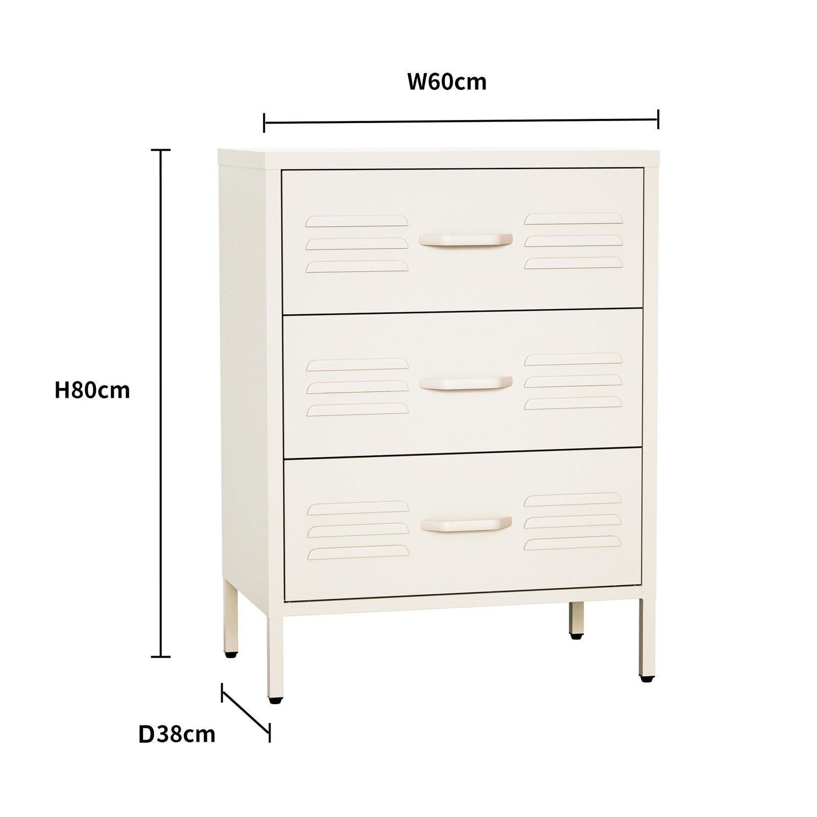 *_Fraser Country Milan Metal Storage Cabinet with 3 Drawers – Cream_*The *Fraser Country Milan Metal Storage Cabinet with 3 Drawers* in Cream offers a durable and stylish storage solution for your home. Crafted from high-quality cold-rolled steel with a cream epoxy powder coating, this unit is both sturdy and attractive. Its pull-handle design and adjustable feet ensure practicality and stability. Ideal for organizing and storing items in any room of your home.* *Versatile Application as a Storage Cabinet*The Milan Metal Storage Cabinet isn't just for specific rooms – it makes a fantastic addition to any part of your home, including:* *Living Room*: Use it to store books, magazines, and decorative items, keeping your living space tidy and stylish.* *Bedroom*: Perfect for organizing clothes, accessories, and other personal items, making it a practical addition to your bedroom.* *Office*: Keep your office supplies and documents neatly organized, providing a clean and efficient workspace.* *Hallway*: Place it in the hallway for additional storage and to hold keys, mail, and other essentials, ensuring an organized entryway.*Highlights** *Durable Construction*: Made from high-quality materials, ensuring long-lasting use.* *Stylish Design*: The cream color and sleek design make it a stylish addition to any room.* *Practical Storage*: Three spacious drawers provide ample storage space for a variety of items.* *Easy Assembly*: The knock-down structure makes setup quick and hassle-free.* *Stable and Secure*: Adjustable feet ensure stability, and the secure packaging ensures safe delivery.* *Pull Handle*: Convenient pull handle design for easy drawer access.* *Adjustable Feet*: Adjustable sets under the feet provide stability on uneven surfaces.Elevate your home organization with the *Fraser Country Milan Metal Storage Cabinet with 3 Drawers* in Cream. Combining functionality, durability, and style, this storage cabinet is the perfect solution for keeping your home tidy and clutter-free.*Installation* With this step by step installation video using our tips and tricks. Will show you exactly how to do it yourself! [https://www.youtube.com/watch?…](https://www.youtube.com/watch?v=aL-w0fOPDUI)*Metal Cabinet Assembly Recommendation** Assemble on a Soft Surface:* Use a carpet to avoid scratches during assembly.* Ensure no hard or small objects are on the surface.* Vacuum the carpet before assembly to remove any objects that could scratch the cabinet during assembly.*Specifications** *Material*: High-quality cold-rolled steel* *Thickness*: Finished δ=0.6+0.7+0.8mm* *Coating*: Epoxy powder coating* *Color*: Cream* *Product Dimensions*: 60cm x 80cm x 38cm (Width x Height x Depth)* *Warranty*: 2 Year