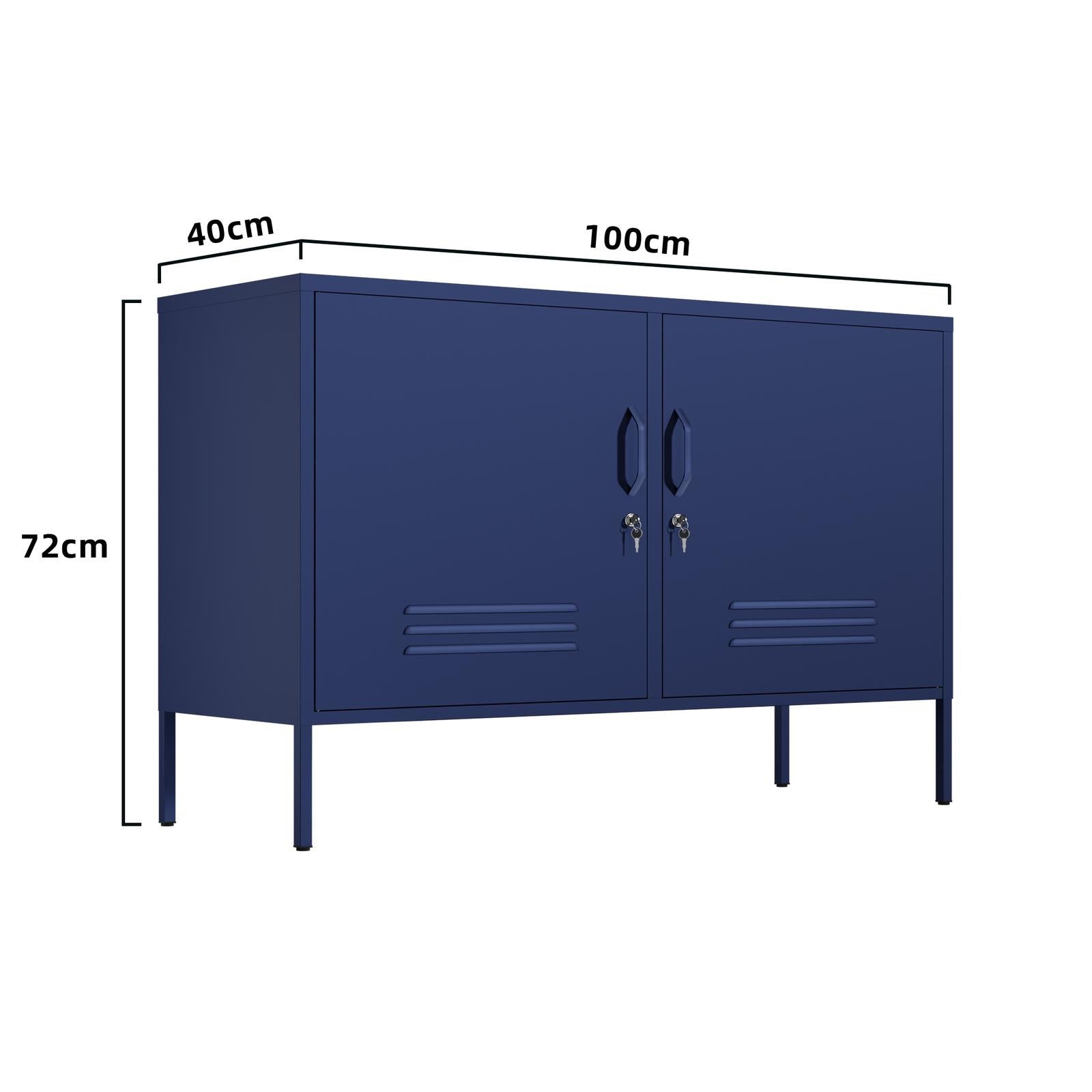 *_Fraser Country Milan Metal Storage Locker & TV Cabinet – Navy Blue_*Enhance your home with the stylish and durable *Fraser Country Milan Metal Cabinet* in Navy Blue. This storage solution is crafted from high-quality cold-rolled steel with an epoxy powder coating for lasting appeal and strength. Organize your space with flair and functionality.This storage locker is a versatile and stylish addition to any home. Designed with multifunctionality in mind, this cabinet can serve as a TV stand, side buffet, kitchen storage, hallway organizer, or even garage storage. Its elegant burnt orange finish complements a wide range of interior decors, adding a touch of sophistication to any space.* *Versatile Applications*The Milan TV Cabinet is perfect for various applications, enhancing the functionality of any room:* *Living Room*: Use it as a TV stand to organize electronics and media accessories.* *Kitchen*: Ideal for storing kitchenware, appliances, and pantry items.* *Bedroom*: Perfect for organizing clothes, accessories, and other personal items.* *Hallway*: Place it in the hallway for additional storage and to hold keys, mail, and other essentials.* *Garage*: Use it for storing tools, equipment, and other essentials, making it a practical addition to your garage storage solutions.*Highlights** *Sturdy Construction*: Made from durable cold-rolled steel.* *Attractive Finish*: Features an eye-catching epoxy powder coating.* *Practical Design*: Pull handle for easy access; adjustable feet for stability.* *Easy Assembly*: Knock-down structure with assembly video link included.* *Versatile Storage*: Ideal for organizing items in any room.* *Secure Locking System*: Equipped with locks to ensure the safety and security of your stored items, making it ideal for use in both residential and secure environments.* *Ample Storage*: Featuring spacious compartments and shelves, this cabinet offers plenty of storage space for electronics, kitchenware, tools, or personal items.* *Convenient Pull Handle*: Provides easy opening and closing.* *Adjustable Feet*: Ensures stability on various surfaces.Elevate your living space with the *Fraser Country Milan Metal Storage Locker & TV Cabinet* in Nordic Salmon. Combining functionality, durability, and stylish design, this cabinet is the perfect solution for organizing any room in your home. With its versatile storage options and thoughtful features, it offers both convenience and peace of mind.*Installation* With this step-by-step installation video using our tips and tricks. Will show you exactly how to do it yourself [https://www.youtube.com/watch?…](https://www.youtube.com/watch?v=kFu6KTDrjH4)*Keys and Locks Instructions** Different Keys for Left and Right Locks:* Keys for the left and right door locks are not interchangeable.* Try all keys attached to the cabinet to match the locks.* Mark the correct keys for each lock once identified.*Metal Cabinet Assembly Recommendation** Assemble on a Soft Surface:* Use a carpet to avoid scratches during assembly.* Ensure no hard or small objects are on the surface.* Vacuum the carpet before assembly to remove any objects that could scratch the cabinet during assembly.*Door Alignment Adjustment** If the left or right doors are not aligned, adjust the height of the feet to balance the cabinet*Door Alignment Adjustment** If the left or right doors are not aligned, adjust the height of the feet to balance the cabinet*Please Note*The color of the metal cabinets as seen in online images may vary slightly from the actual product. This slight difference can be due to screen lighting and display settings. We strive to provide the most accurate representation possible, but variations may occur*Specifications** *Material*: High-quality cold-rolled steel.* *Thickness*: Finished δ=0.6+0.7+0.8mm.* *Coating*: Epoxy powder coating.* *Color*: Navy Blue.* *Product Dimensions*: 100 cm x 72 cm x 40 cm (WxHxD)* *Warranty*: 2 Year