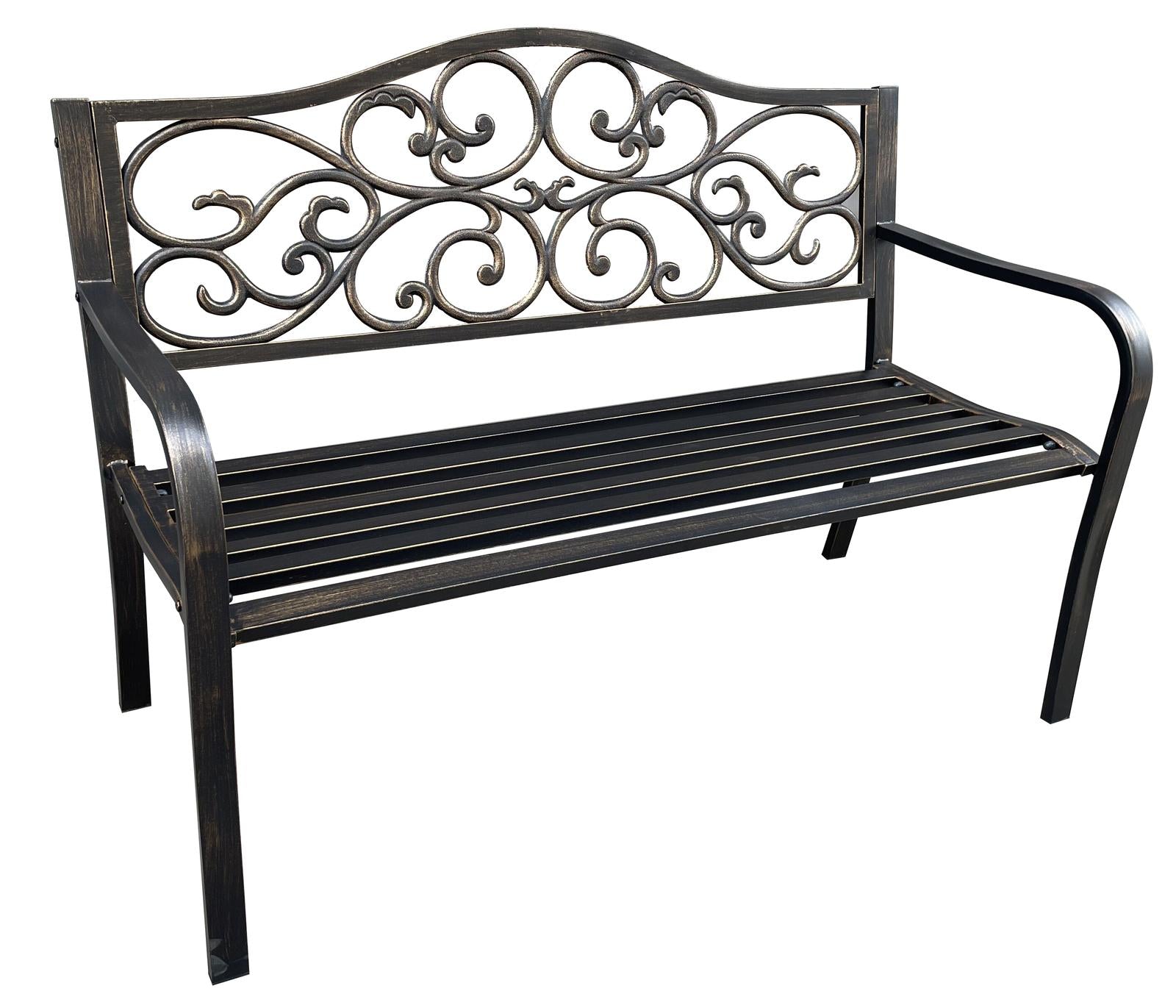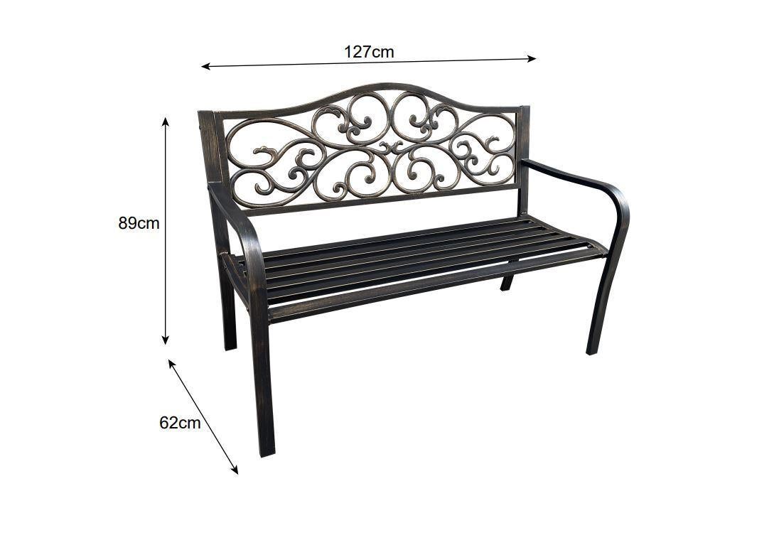 *Fraser Country Outdoor Metal Garden Bench with Floral Design – Bronze*Elevate your outdoor space with the Fraser Country Outdoor Metal Garden Bench, featuring a beautifully intricate floral design. This sturdy bench is crafted from steel and cast iron, offering a robust yet elegant seating option for your garden, patio, or terrace. Coated with a durable bronze powder finish, it resists the elements while adding a touch of classic charm to any outdoor setting.*Features:** *Durable Construction:* Made from high-quality steel and cast iron for long-lasting use.* *Elegant Design:* Ornate floral backrest adds a touch of sophistication and artistry.* *Weather-Resistant:* Powder-coated finish protects against rust and harsh weather conditions.* *Spacious Seating:* Accommodates up to two people, providing a comfortable outdoor seating solution.*Specifications:** *Material:* Steel and Cast Iron* *Seat Components:* 6 steel slats* *Pipe Size:* 40 × 20 × 0.8 mm* *Color:* Bronze* *Dimensions (L x W x H):* 127 × 60 × 89 cm* *Net Weight:* 14.5 kgThis bench is perfect for garden lovers who want both beauty and durability in their outdoor furniture. Its timeless design pairs well with any outdoor décor, making it an ideal choice for enjoying leisurely moments outdoors.