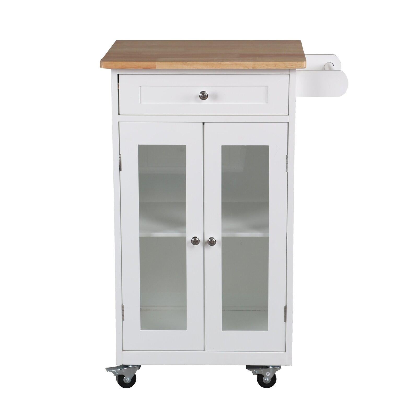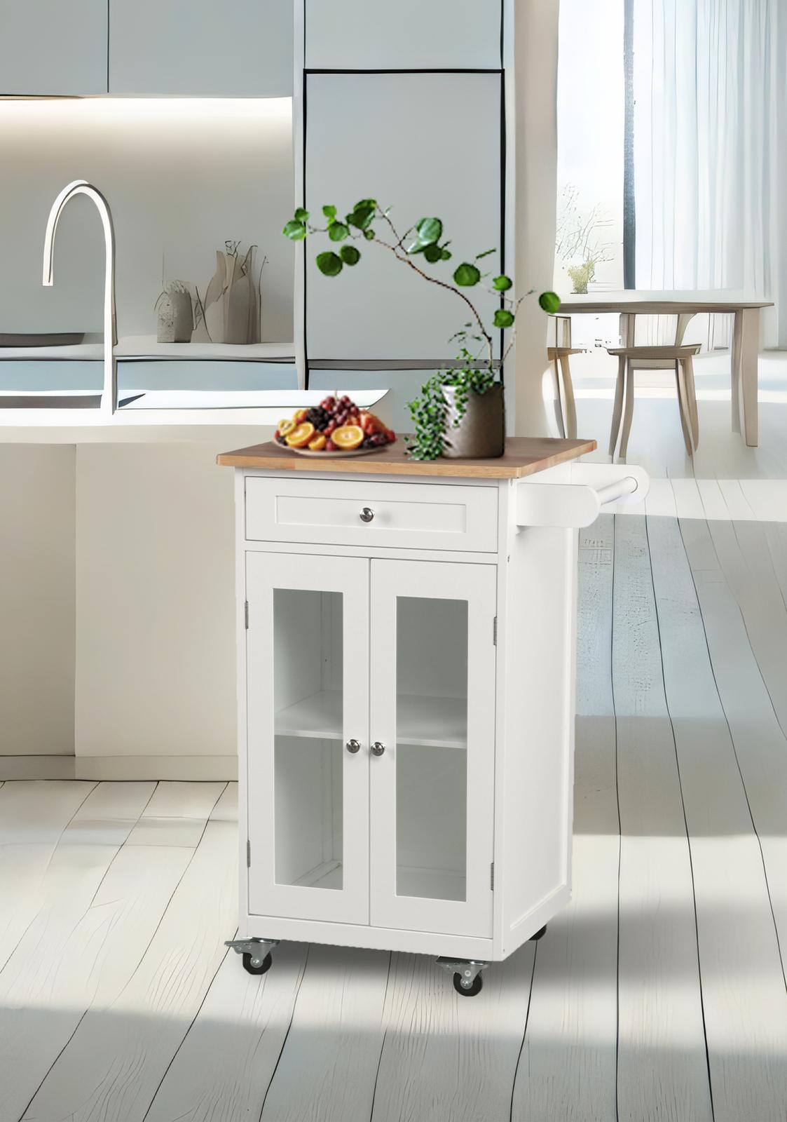 *_Fraser Country Wooden Kitchen Trolley with Drawer & 2 Door_*Add both style and functionality to your kitchen with the *Fraser Country Wooden Kitchen Trolley with Drawer & 2 Doors*. Designed to provide ample storage and ease of movement, this trolley is a perfect addition to any modern kitchen.*Features** *Easy Assembly*: The trolley is easy to assemble, allowing you to quickly set it up and start using it in no time.* *Smooth Mobility*: Featuring 2 steady casters and 2 lockable casters, this trolley can be easily moved around the kitchen and securely locked into place when needed.* *Durable Rubber Wood Top*: The natural rubber wood top offers a sturdy and durable surface that is perfect for food preparation or serving.* *Ample Storage Space*: With a spacious drawer and two-door cabinet, this trolley provides plenty of storage for your kitchen essentials, keeping them organized and within reach.*Highlights** *Versatile Design*: This kitchen trolley combines practicality with style, making it a versatile addition to any kitchen, dining room, or entertaining space.* *Quality Construction*: Made from high-quality materials including pine wood and MDF, with a durable rubber wood top, this trolley is built to last.* *Convenient and Mobile*: The combination of a drawer, cabinet space, and a smooth rolling design makes this trolley a practical and convenient solution for all your kitchen needs.* *Stylish and Functional*: The white and natural wood finish adds a touch of elegance to your kitchen while providing functional storage and workspace.*Specifications:** *Product Dimensions*: 60 × 45 × 85 cm* *Materials*: Pine Wood, MDF, Rubber Wood Top* *Color*: Elegant white with a natural wood top* *Product Weight*: 14.2 kgUpgrade your kitchen with the *Fraser Country Wooden Kitchen Trolley with Drawer & 2 Doors*—a perfect blend of style, storage, and convenience.