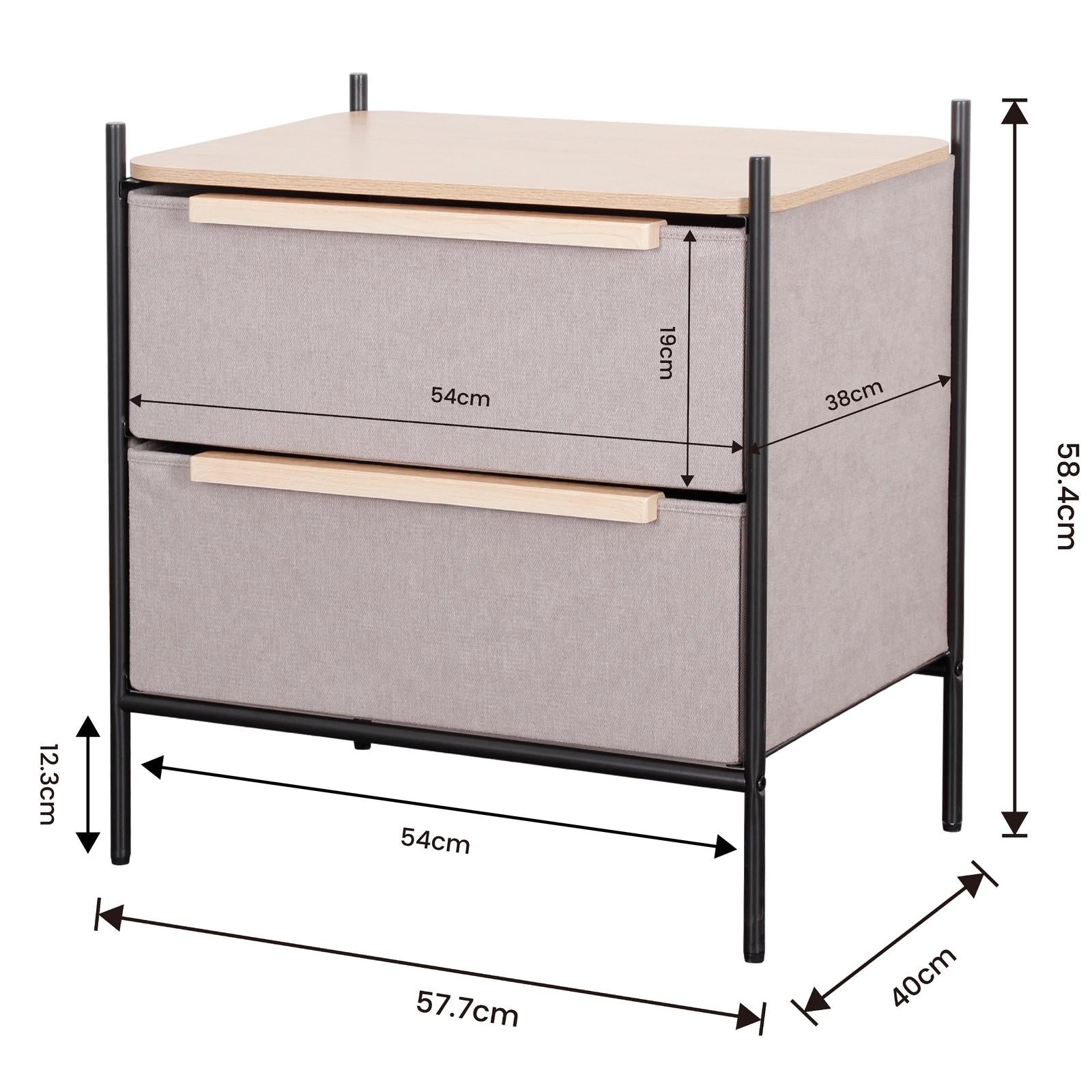 Keep your nighttime essentials organised and on hand in the spacious drawers of the *Fraser Country – 2 Drawer Byra Nightstand*, the perfect addition to any bedroom.*Fraser Country 2 Drawer Byra Nightstand Bedside Table* , Where Scandinavian elegance meets industrial chic. This versatile piece is designed with a sleek, minimalist aesthetic that effortlessly blends into any contemporary space. Its clean lines, neutral tones, and functional design make it a perfect addition to modern, minimalist, and mid-century interiors.Boasting breathable fabric drawers and sturdy top shelf space, the *Fraser Country – 2 Drawer Byra Nightstand Bedside Table*offers effortless storage for all your nighttime essentials while the simple and clean beige design complements your existing bedroom decor.*Features** 2 Fabric drawers with wood handles finish* Ultra-durable steel frame with MDF top and MDF handle* Easy assembly* Dimensions (L x W x H): 577 × 400 × 584mm* Height from the floor to the space under the first drawer is 13.7cm*Specifications** *Dimensions:* 577 × 400 × 584mm* *Drawer Dimensions:* W 54 X H19 D 38cm 540 × 190 × 380mm* *Weight:* 8.2kg* *Colour:* Black Frame Grey Fabric Oak Finish MDF shelf* *Frame Material:* Metal* *Material:* Fabric and MDF* *Primary Material:* Faux Linen, Metal , MDF* *Weight Capacity:* Top MDF bearing capacity weight: 8kg |* *Drawer bearing capacity weight*: 3kg*WARRANTY*Mighty Ape offers 1 Year Warranty. This warranty covers all manufacturing faults or defects. It does not cover wear, tear & spillage, or damage caused by use, accident, or failure to follow care instructions. The warranty is valid for 1 Year from the date of the order and is available to the original purchaser of the product only
