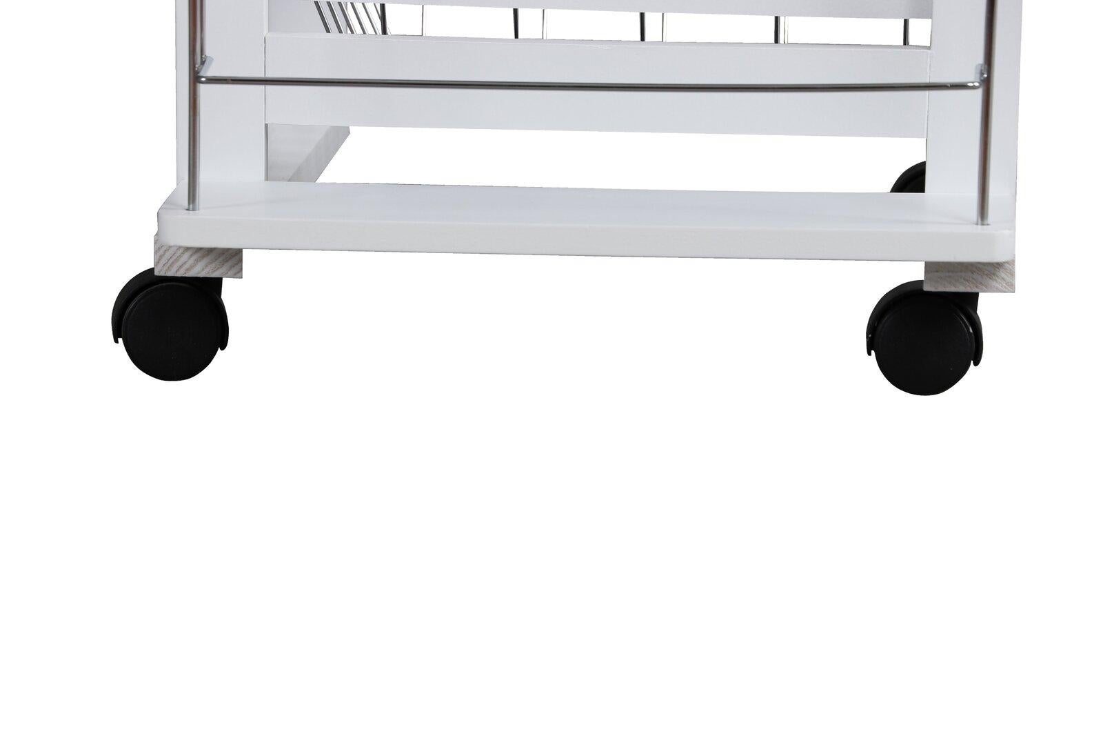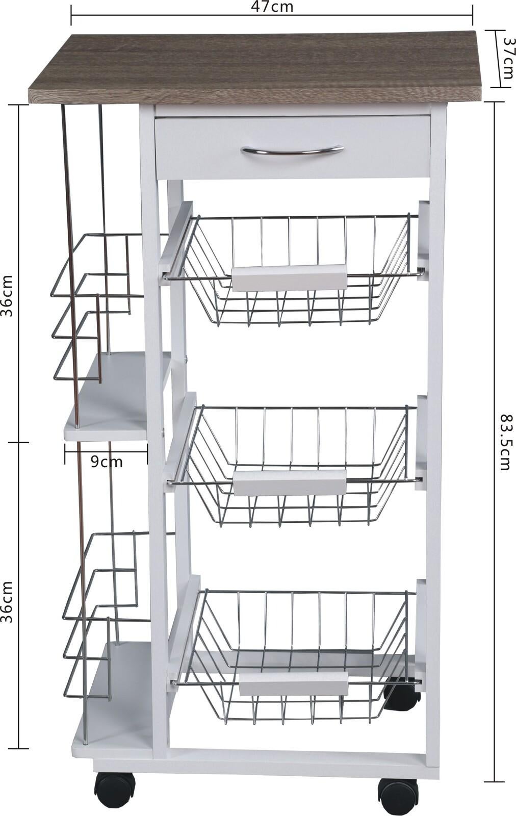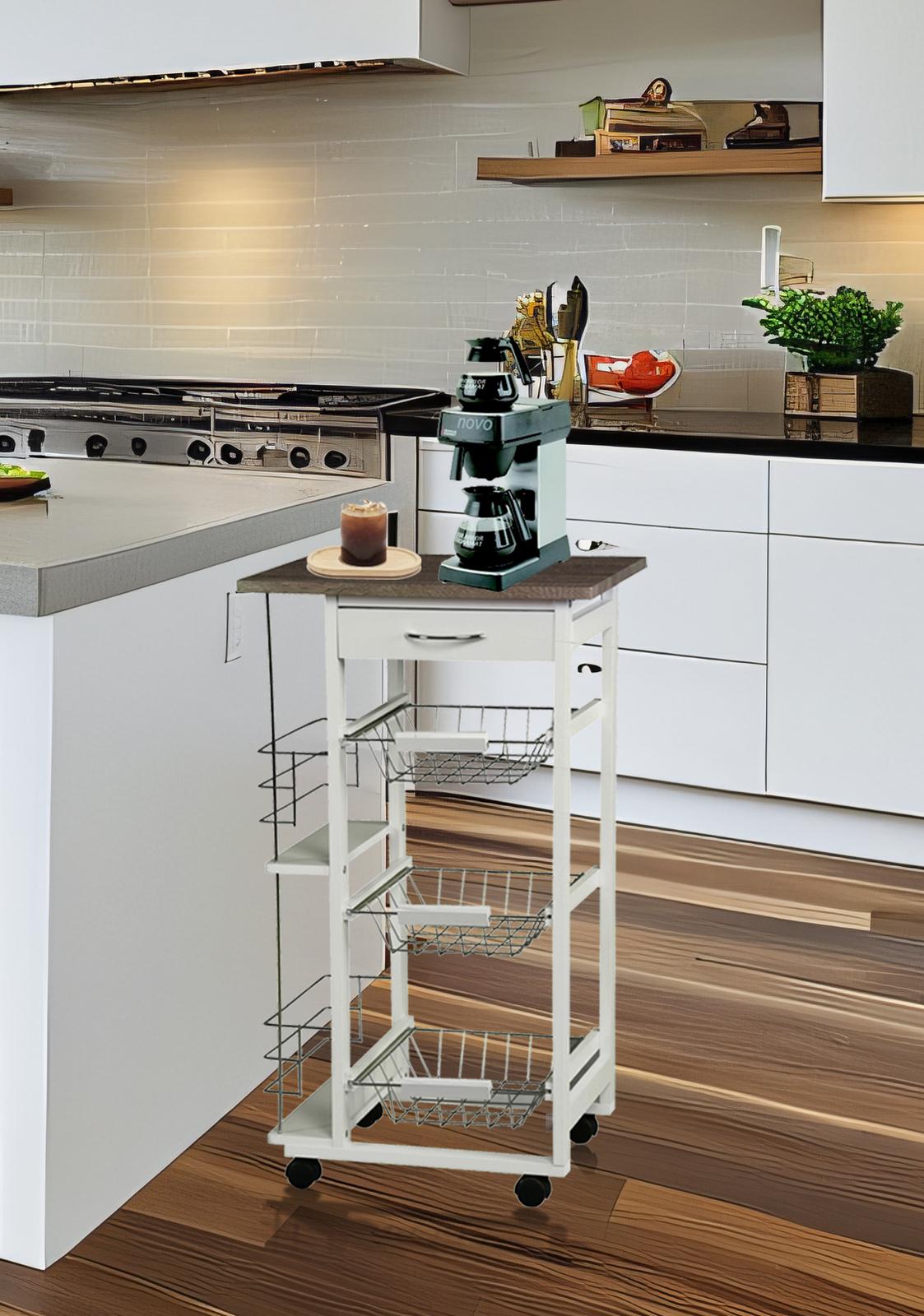 *_Fraser Country 4-Tier Kitchen Trolley_*Optimize your kitchen space with the *Fraser Country 4-Tier Kitchen Trolley*. This stylish and functional trolley offers convenient storage solutions while adding a touch of elegance to your kitchen.*Features** *Easy Assembly*: The trolley is designed for quick and straightforward assembly, allowing you to set it up with minimal effort.* *Easy Moving*: Equipped with smooth-rolling casters, this trolley can be effortlessly moved around your kitchen or dining area.* *Side Shelves for Storage*: The integrated side shelves provide additional storage space, perfect for holding bottles, jars, or other kitchen essentials.* *Convenient Drawer*: The built-in drawer offers a handy space for storing loose items such as utensils, napkins, or small kitchen gadgets.* *Small Footprint*: With its compact design, this trolley is ideal for smaller kitchens, providing extra storage without taking up too much space.*Highlights** *Versatile and Practical Design*: This trolley provides a versatile storage solution, whether used in the kitchen, dining room, or as a serving cart during gatherings.* *Durable Construction*: Crafted from high-quality materials, including MDF and pine wood, this trolley is built to last while maintaining a stylish appearance.* *Maximized Storage*: The combination of a drawer, side shelves, and wire baskets allows you to keep your kitchen organized and clutter-free.* *Space-Saving*: Perfect for compact spaces, this trolley offers ample storage without occupying too much room, making it an excellent addition to any kitchen.*Specifications:** *Product Dimensions*: 47 × 37 × 83.5 cm* *Materials*: MDF, Pine Wood, MFC Top* *Color*: Clean and modern white* *Product Weight*: 6.8 kgEnhance your kitchen's functionality and style with the *Fraser Country 4-Tier Kitchen Trolley*. This practical and elegant piece is the perfect solution for organizing and storing your kitchen essentials.