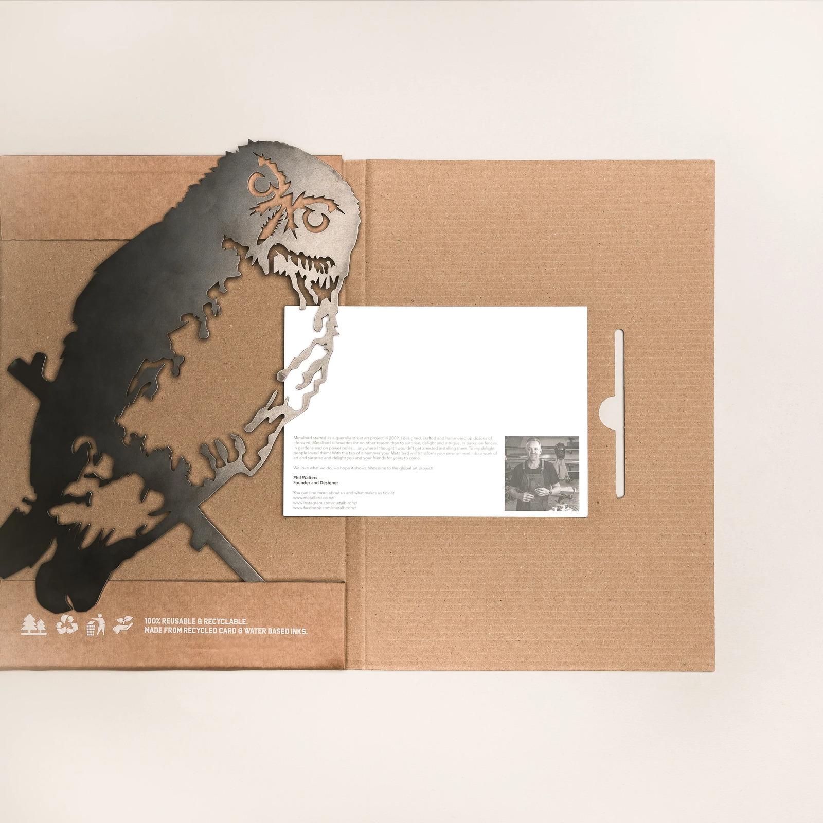 Often heard, rarely seen, it’s very hard to get a close encounter with a Ruru. It hangs out in dense forests, singing out its English name – more-pork. Silent flight is one of its superpowers along with the ability to rotate its neck 270 degrees, not to be creepy but to look for prey like moths, beetles, mice and lizards. Ruru’s big shining yellow eyes play an important part in Maori mythology and tradition. It’ll look amazing in your backyard especially with the full moon behind it.Our Ruru is:✓ 31cm high by 24cm wide approximately 300g✓ Easy to send our regular boxes are standard letter size, measuring 31cm x 21 cm x 1cm✓ Same day dispatch on orders placed before 2pm on weekdays✓ Made locally in a family-owned factory, right here in NZ✓ Crafted from 3mm Corten steel and designed to last a lifetime✓ Easy to install holding on a downwards angle simply tap the thickest end of the stake with a hammer or mallet until secureOur birds are designed with 3mm CorTen steel to form a protective patina that deepens and strengthens with the seasons. This patina will deepen in shade over the years until it reaches a deep brown/charcoal black hue.This self-sealing aspect of CorTen steel provides a quality guarantee of up to 100 years, ensuring that our product lasts a lifetime and remains completely corrosion resistent.What might initially resemble generic rust is simply the air and water-tight patina forming over a six month period, so don’t panic! Your Metalbird is doing exactly what it’s been designed to do, and this patina will protect the steel from any further damage and disintegration.CorTen steel does not require any treatments, oils or chemical additives and is therefore extremely environmentally friendly.