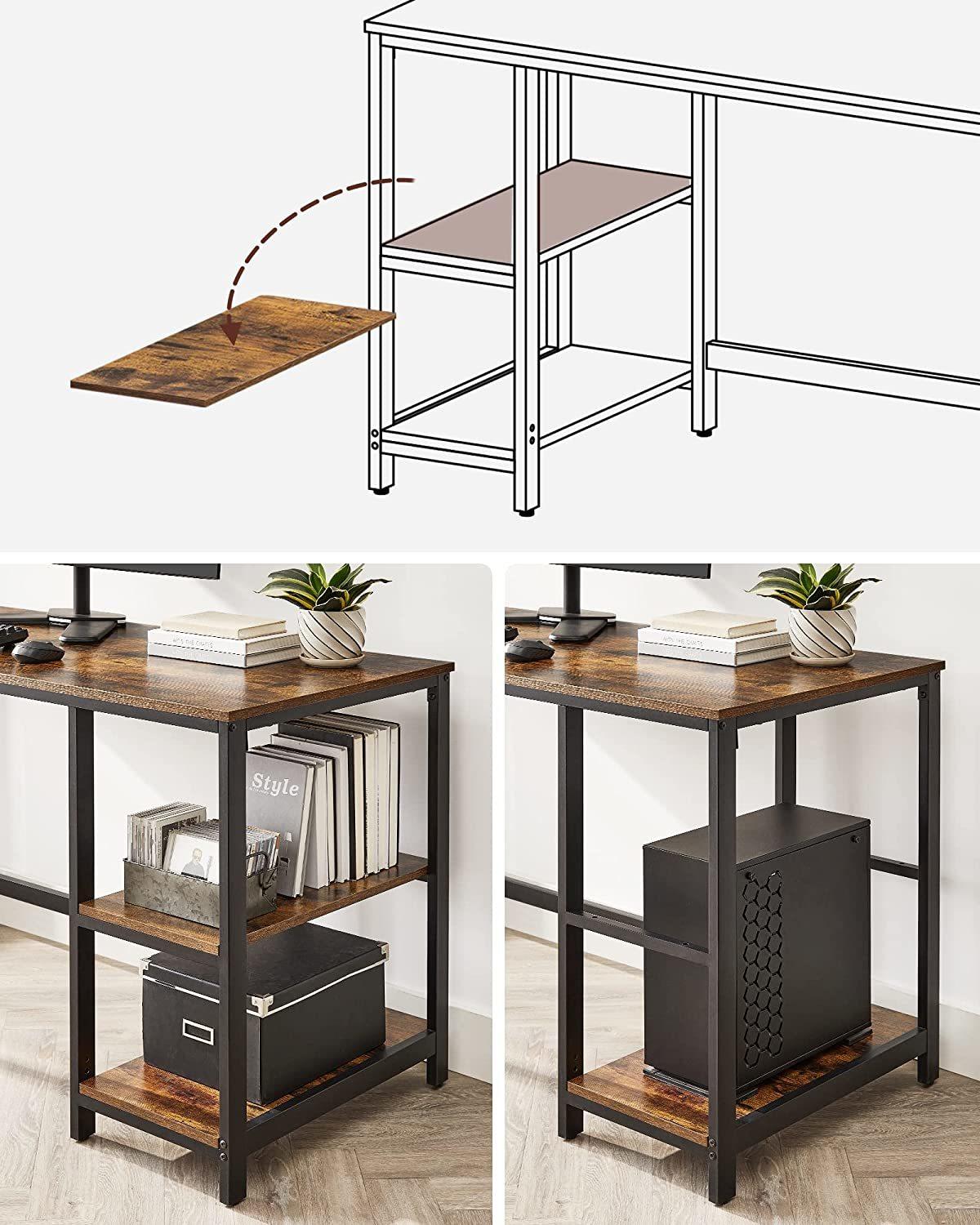 *VASAGLE Computer Desk with 2 Shelves – Rustic Brown** *CONFIDENT STYLE*This tasteful, industrial-style computer desk unifies rigid metal with dark, wooden boards for a unique display of delicate charm; you can work at this industrial desk with the confidence that you made the right choice for your home* *ALL IN REACH*With a *60D x 140W cm* desktop, this computer desk accommodates 2 computer monitors, a keyboard, and other office essentials while giving you enough workspace, keeping you productive when working from home* *STABLE FOR WORK*Say goodbye to annoyances – the thicker metal frame (1.2mm), reliable wooden boards, and adjustable feet work to ensure that your computer desk is stable and won't wobble with every stroke of your pen or button pressed on your keyboard* *ASSEMBLY MADE SIMPLE*Nobody wants to spend their entire Sunday afternoon assembling a writing desk; with easy-to-follow instructions and included assembly tools, you'll be typing away on this vintage desk before you know it* *100% SATISFACTION*VASAGLE provides you with professional customer service both before and after your purchase; don't wait any longer, add this to your home today* *Be productive in style*Let your desk look as good as your work with this industrial-style writing desk by VASAGLE. Place it in your office, study, living room, bedroom, or anywhere you want to be more productive. With a stable, thicker metal frame (1.2 mm) and durable wooden boards, this desk not only looks good but will last for years to come.* *Left or right, it's your choice*The computer desk comes with 2 shelves that can be assembled on the left side of the desk or the right, depending on your preference. Place your favourite books, decorations, or notes on the shelves for easy access. If you need room for a large computer tower, you can remove the top shelf for some extra space. Don't worry about the assembly process – our instructions are easy to follow and we include the assembly tools required to get the job done.If you love the look of this industrial-style writing desk, be sure to check out our other furniture in this series designed by VASAGLE.*Specifications** Colour: Rustic Brown, Black* Material: Particleboard, Steel* Product Size: 140 × 60 × 75 cm (L x W x H)* Product Weight: 28kg*Package Contents** 1 x Desk with Cupboard and Drawer* 1 x Accessory Kit* 1 x Instructions (EN, DE, FR, ES, IT)*VASAGLE Notes** Keep product away from fire sources.* Do not place any hot objects on the surface of the product.* Avoid long-term contact with water.* Keep product away from sharp objects.*WARRANTY:*Mighty Ape offers 1 Year Warranty. This warranty covers all manufacturing faults or defects. It does not cover wear, tear, or damage caused by use, accident, or failure to follow care instructions. The warranty is valid for 1 Year from the date of the order and is available to the original purchaser of the product only.*About Vasagle Furniture:*Nice-looking, well-made, and budget-friendly furniture is available for all families. Choose your favorites and reinvigorate your home with ease.