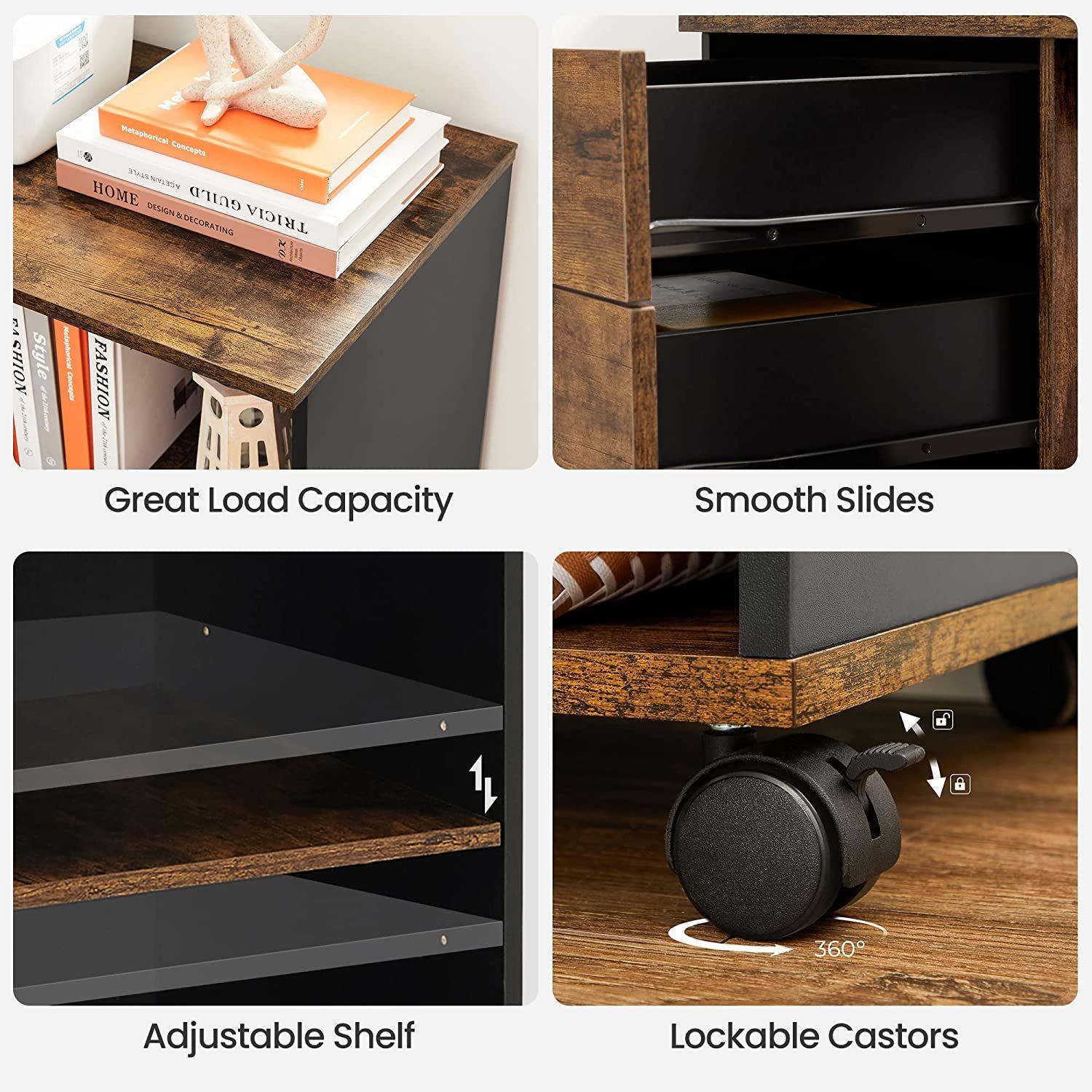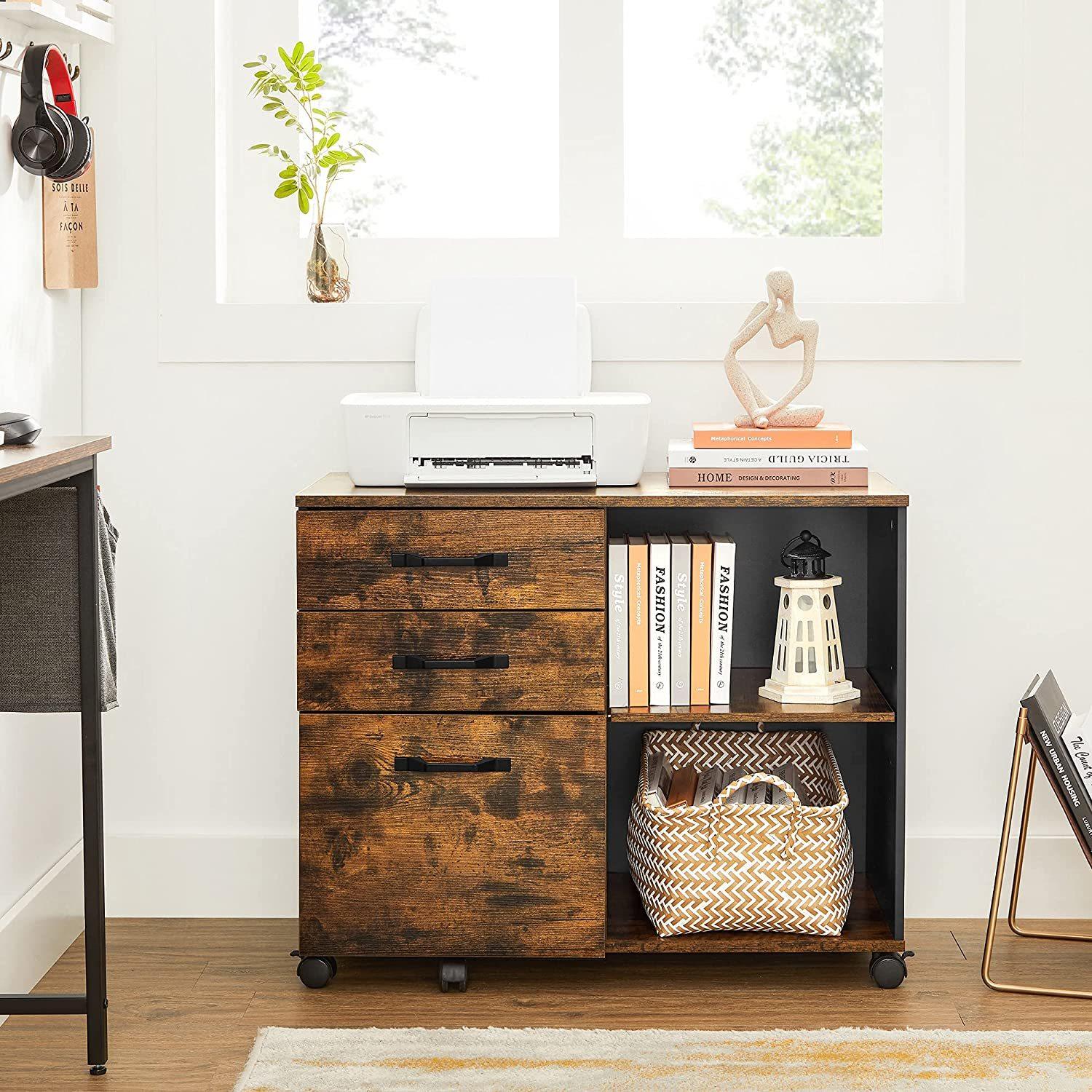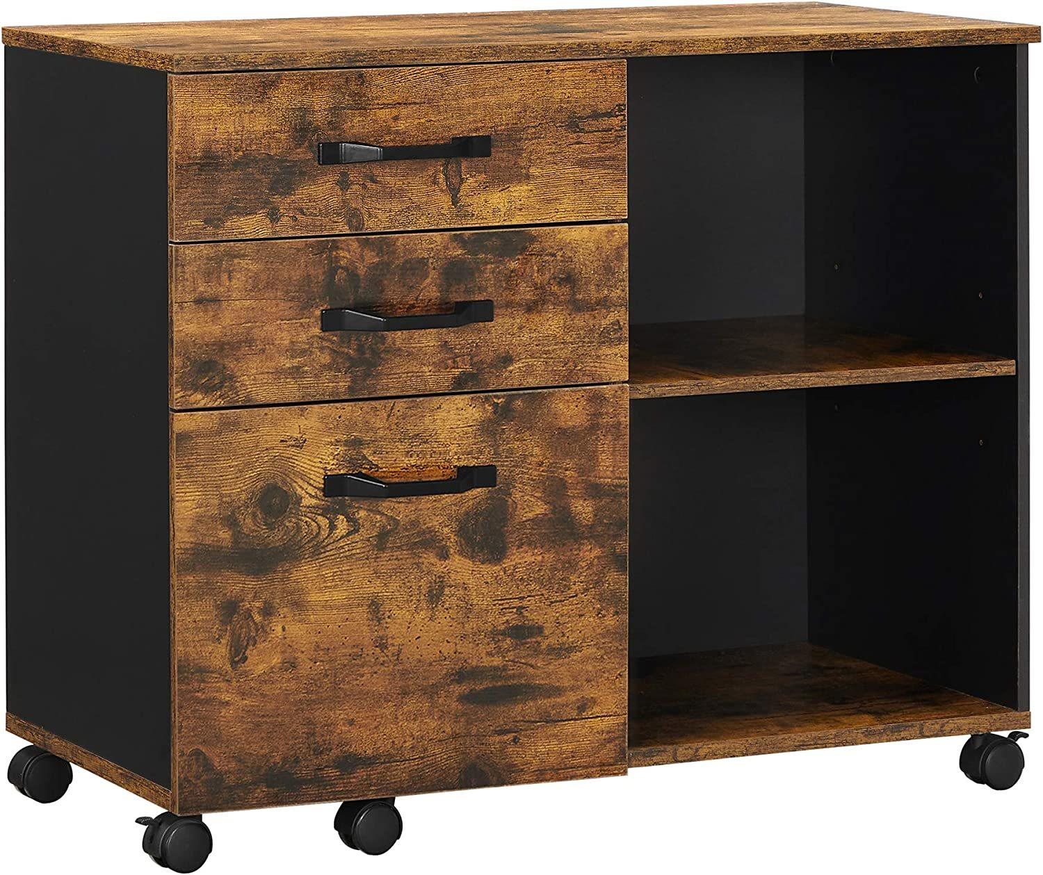 *VASAGLE File Cabinet with Storage Compartment** *Calculate*How much time have you wasted by looking for misplaced documents in a mess? Too many to count on ten fingers? Here comes the solution—a lateral filing cabinet with 3 drawers and 2 compartments—to help you restore a tidy work area* *Catches All*3 drawers with hanging rails inside the bottom drawer for various office supplies and A4 or letter-sized folders, 2 compartments with an adjustable shelf for paper reams and books within easy reach, and 1 large desktop? Perfect for a printer!* *Like a Rolling Cart*5 quality wheels with 2 brakes offer effortless mobility from one location to another—around your home study or office, even when fully loaded—making it like a rolling cart for access to your paperwork at any point in time* *A Breeze to Install*With easy-to-follow instructions and numbered parts, you’ll have this rolling cabinet set up before you figure out where to place it. Sometimes keeping things simple is all you need to get the job done* *What You Get*A multi-functional rolling file cabinet made of durable particleboard, easy assembly, industrial design, and plenty of storage space that’ll surely quench your thirst for a chic and durable storage solution*Specifications** Colour: Rustic Brown, Black* Material: Particleboard, Metal Handle* Product Size: 80 × 40 × 66 cm (L x W x H)* Product Weight: 22.2 kg* Max. Static Load Capacity: 40 kg*Features** Spacious DesktopThis lateral filing cabinet boasts a large desktop sized 80 × 40 cm (L x W), which works great for a printer or a scanner.* Open CompartmentsOpen compartments separated by an adjustable shelf make it easy to accommodate both short and tall items.* Practical DrawersWith hanging rails inside the large bottom drawer, these 3 practical drawers can hold a variety of office supplies and A4 or letter-sized files.*Package Contents** 1 x File Cabinet* 1 x Accessory Kit* 1 x Instructions (EN, DE, FR, ES, IT)*VASAGLE Notes** Children are not allowed to climb or play on the product for safety reasons*WARRANTY:*Mighty Ape offers 1 Year Warranty. This warranty covers all manufacturing faults or defects. It does not cover wear, tear, or damage caused by use, accident, or failure to follow care instructions. The warranty is valid for 1 Year from the date of the order and is available to the original purchaser of the product only.*About Vasagle Furniture:*Nice-looking, well-made, and budget-friendly furniture is available for all families. Choose your favorites and reinvigorate your home with ease.