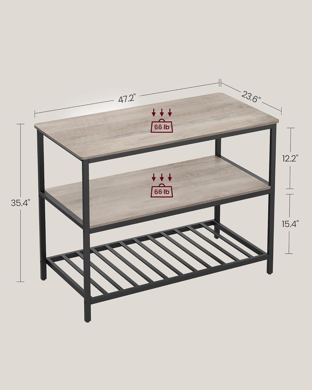 *_VASAGLE Kitchen Island with 3 Shelves – Greige/Black_** *Large Worktop*The 23.6”D x 47.2”W surface of this kitchen island allows you to prepare food while being spacious to keep a toaster or coffee machine close by. Large worktop for great convenience!* *3-Tier Storage*Place a flower vase or a tea set on the top, kitchen appliances on the middle shelf, and storage boxes with bakeware on the lower grid shelf—everything is nicely organized on this 3-tier Island table with easy access* *Versatile*With a 35.4" height, this kitchen table is exceptionally versatile: use it as a breakfast table to grab a bite to eat, a coffee bar for coffee machine and accessories, or a bar table for serving up drinks…totally up to you!* *No Wobbles, No Scratches*Say bye to small annoyances—the adjustable feet prevent the kitchen island from wobbling on slightly uneven floors and protect your floor from unwanted scratches* *Assembly Is a Snap*No tricky assembly here. With clear instructions, numbered parts, and an assembly tool included, you’ll be able to assemble this baker’s rack before you know it*Highlights** Greige FinishThe greige colors of this kitchen island brings a touch of modern living to your space.* Solid StructureThe particleboard and the steel frame combine to offer a sturdy and strong structure for long-term use.* Adjustable FeetPrevent the table from wobbling on slightly uneven floors and protect your floor from scratches.*Specifications** Color: Greige, Black* Material: Particleboard, Steel* Product Size: 23.6”D x 47.2”W x 35.4”H (60 × 120 × 90 cm)* Product Weight: 55.2 lb (25.1 kg)* Max. Static Load Capacity per Shelf: 66 lb (30 kg)*Package Contents** 1 x Kitchen Island* 1 x Assembly Kit* 1 x Instructions*VASAGLE Notes*Children are not allowed to climb or play on the product for safety reasons.