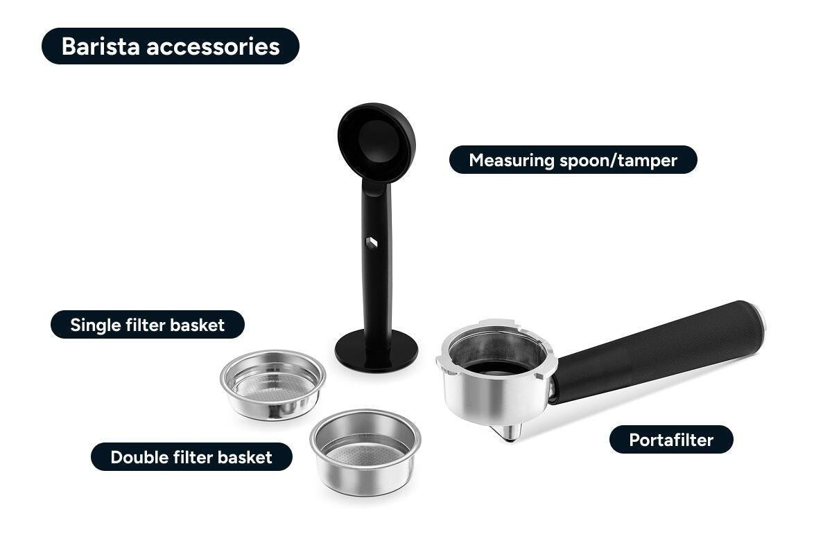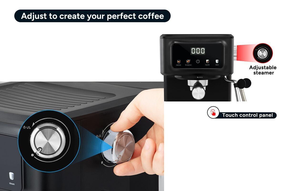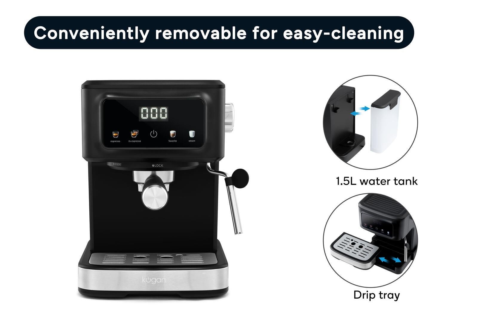 Brew rich, café-quality coffee at home with the Kogan™ Espresso Coffee Machine, featuring powerful 15-bar pressure, a touch panel for customisable espresso options and a steam wand for crafting perfect lattes and cappuccinos.* _15-bar pressure pump._ Delivers rich, full-flavoured espresso every time.* _Touch panel controls._ Select between single or double espresso shots.* _Steam wand._ Adjustable pressure for creating creamy lattes and frothy cappuccinos.* _Durable construction._ Aluminium boiler for long-lasting use and heat retention.* _Safety features._ Includes overheating and overpressure protection for peace of mind.* _Easy cleaning._ Detachable drip tray and 1.5L transparent water tank. Precision brewing with 15-bar pressureThe powerful 15-bar pressure pump extracts every note of flavour from your coffee grounds, ensuring a rich and aromatic cup with a smooth crema. Experience professional-quality espresso from the comfort of your kitchen.Simple to use touch controlsThe touch panel offers single or double espresso shot options, as well as favourite and steam buttons, allowing you to tailor your coffee to your taste. With just a touch, you can enjoy barista-style espresso made effortlessly at home.Versatile steam wand for café-style drinksElevate your coffee experience with the adjustable steam wand, perfect for creating velvety lattes and frothy cappuccinos. The easy-to-use steam knob gives you complete control over your milk texture and temperature.Durable and easy to maintainCrafted with a die-casting aluminium alloy boiler, this machine ensures excellent heat retention and long-lasting durability. The detachable drip tray and transparent 1.5L water tank make cleaning and refilling simple, so you can focus on enjoying your coffee.*Technical Specifications*Dimensions* Dimensions: 160 × 306 × 308mm* Weight: 3.1kgFeatures* Colour: Black* Detachable: Water tank & Drip tray* Overheat Safety Protection: Yes* Safety Features: Over pressure protectionFunctions* Preset Programs: Single espresso, Double espresso, Favourite & SteamGeneral* Control Panel: Touch panel* Frothing: High-pressure frothing* Knob Type: Adjustable steam knob* Material: Die-casting aluminium alloy boiler* Type: Coffee Machine* Wand: Steam wand* Water Tank Capacity: 1.5LPerformance* Pressure: 15barPower* Power Supply: 220–240V, 50–60Hz* Wattage: 1050WWarranty* Manufacturer Warranty: 1 Year