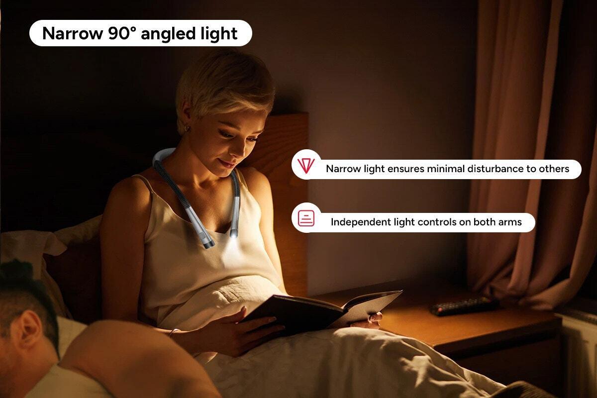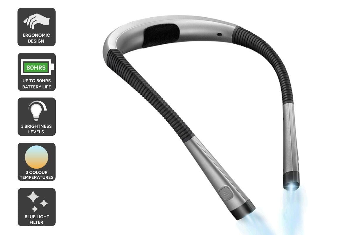 Don’t let the dark keep you from seeing what's immediately in front of you with this Rechargeable LED Neck Light, designed for optimal lighting regardless of the location or light conditions.* _Ergonomic design._ Sits comfortably around your neck.* _Adjustable light angles._ Ensures optimal light direction.* _90° narrow light beam._ Won’t disturb others nearby.* _3 brightness levels._ Perfect lighting for any setting.* _Long battery life._ Up to 80 hours of uninterrupted runtime.* _Versatile usage._ Useful for any low-light activities. Comfortable ergonomic designThis rechargeable neck light features an ergonomic design that sits comfortably around your neck, allowing you to read or work without turning on the lights or holding a torch. The design ensures you maintain a comfortable posture, reducing neck and shoulder strain. Whether you're lounging in bed, sitting in your favourite chair or on a long-haul flight, this light will provide the perfect hands-free lighting experience.Versatility to suit your purposesThis neck light is ideal for a range of uses. Whether reading from a book, e-reader or tablet, knitting at night in bed, working in the garage late at night, or camping, it effectively lights up what's immediately in front of you without needing to turn on the lights of your room or space.Optimal lighting adjustmentsWith two angle-adjustable lights, this neck light offers optimal lighting for your needs. The 90° narrow light beams ensure focused illumination, making it perfect for focusing without disturbing others. Each light can be independently controlled, providing personalised lighting that suits your preferences, ensuring you can always find the ideal lighting for your requirements.Customisable brightness and temperatureThis neck light offers 3 brightness levels and 3 colour temperatures (warm, white and neutral), allowing you to customise your lighting to suit any environment. The blue light filter helps reduce eye strain during extended reading sessions, ensuring your eyes remain comfortable even after hours of use.Long-lasting rechargeable batteryPowered by a 1000mAh battery, the light provides up to 80 hours of continuous use, with quick and easy recharging via USB-C.*Technical Specifications*Dimensions* Dimensions: 25.4 × 18.8 × 2.8cm* Weight: 145gFeatures* Colour: Silver* Flicker-free: Yes* Low Blue Light: YesFunctions and Features* Adjustable Angle: Adjustable light anglesGeneral* Beam Angle: 90° narrow light beam* Colour Temperature: Neutral: 3000K | Warm white: 4000K | Cool white: 6000K* Design: Around-neck design* Light Modes: 3 brightness levels* Lumens: 60 lumens* Material: ABS* Type: Neck Reading LightPower* Battery Capacity: 1000mAh* Battery Life: Up to 80 hours (General reading, single head)* Battery Voltage: 3.7V* Charging Interface: USB-CWarranty* Manufacturer Warranty: 1 Year