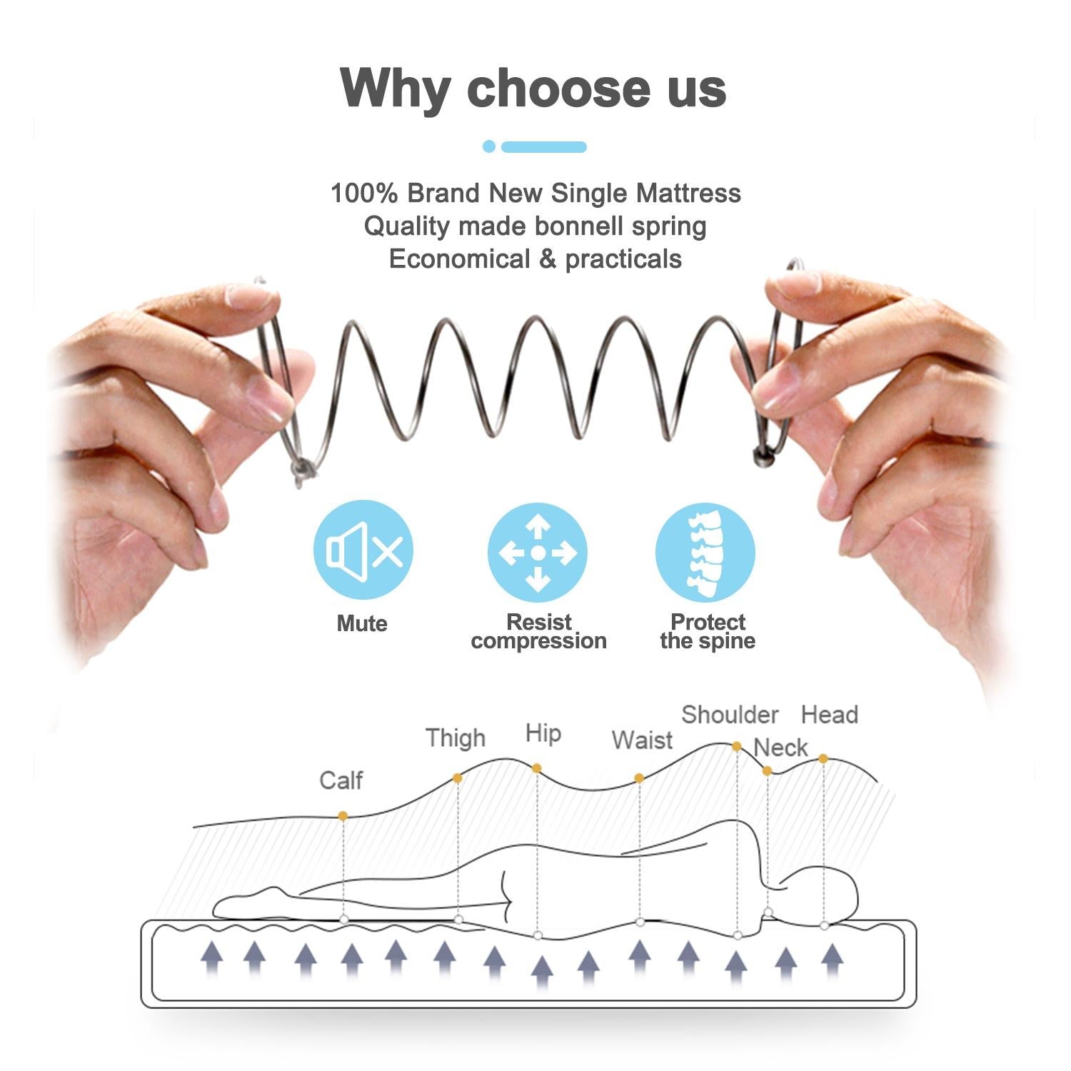 This basic Bonnell spring mattress uses quality bonnell springs to provide medium firmness which helps the mattress to better retain its shape. It comes padded with comfy foam and is upholstered with knitted polyester fabric to offer you an exceptional comfort and cosiness. Designed to offer support for your body while you sleep, the mattress helps in relieving stress from hips, spine, shoulder, and neck, providing you with a good quality mattress and a great night's sleep which does not have to cost a fortune.*Features:** Quality made bonnell spring* 15cm thickness medium firmness mattress* Soft quilting layer with knitted polyester for optimum comfort* Padded with comfortable foam* Confirming body support and ergonomics* Comes with handy vacuum packaging* Fits the standard New Zealand single bed*Specifications:** Product size: 92cm(W) x 188 (L) x 15cm(T)* Material: Metal bonnell spring with foam, and polyester quilt* Thickness: 15cm* Firmness: Medium* Product weight: 11.9Kg* Colour: Top white & side black* Product warranty: 12 Months*Package contents:** 1 x Basic bonnell spring mattress – Single*Note: We use special equipment to compress our rolled packed mattress, once you unroll them they cannot be returned to their shipping size.*
