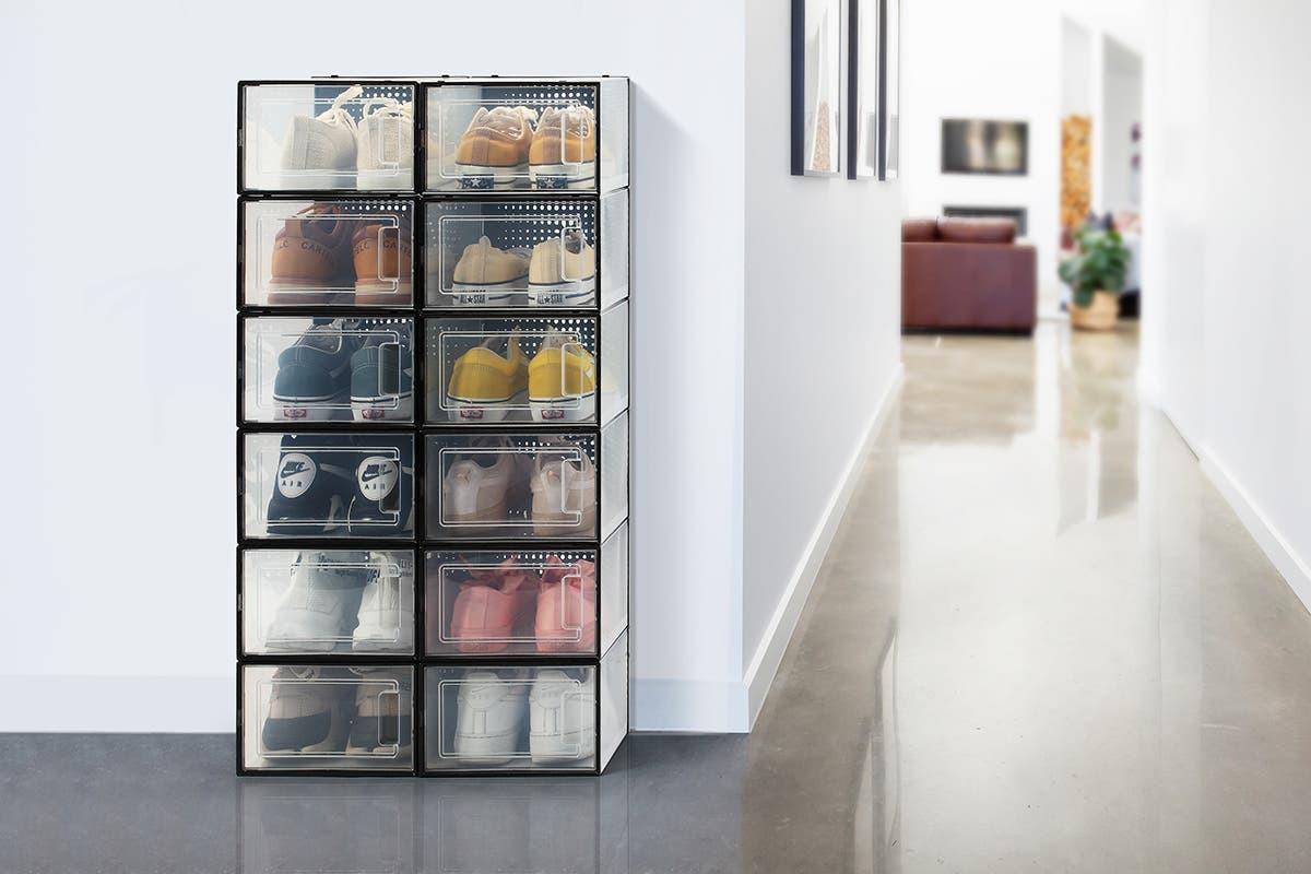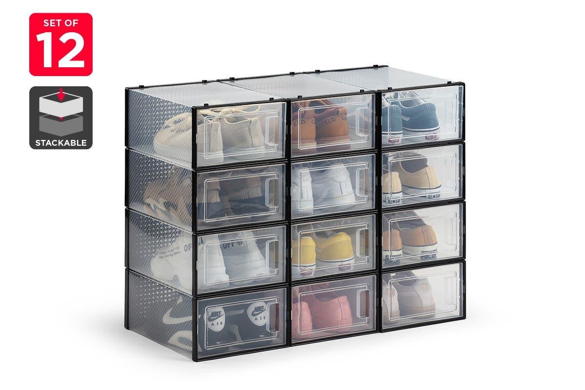 Keep your shoe collection neatly organised and stored away in their own individual capsules with the Ovela Click Shoe Box.*Features** Set of 12 shoe boxes* High-quality, clear ABS material* Ventilation for shoe preservation* Stackable, collapsible design* Box size 33.4 × 23 × 14cm*Preserve your investment*Preserve the like-new quality of your shoes for years to come with the ventilated rear ABS panel, allowing for oxygen to flow through the box.*Stack and store*Customise your shoe space however you like with the interlocking design of the Ovela Click Shoe Box.*Specifications** *Dimensions:* Box Size: 33.4 × 23 × 14cm* *Weight:* 3.5kg* *Colour:* Clear, Black* *Size:* SmallDiscover more shoe boxes from the [Shoe Storage](https://www.mightyape.co.nz/home-living/home-storage/bedroom-wardrobe/shoe-storage/all?q=brand%7Eovela)