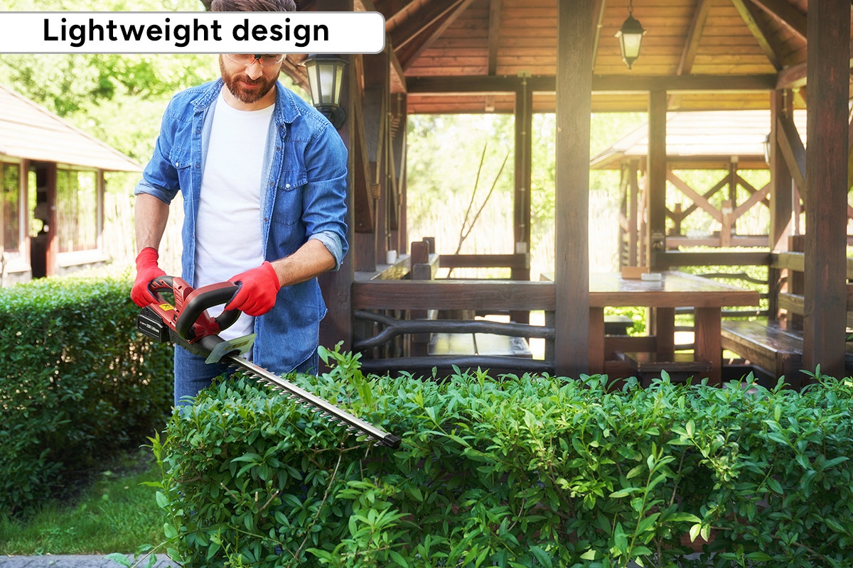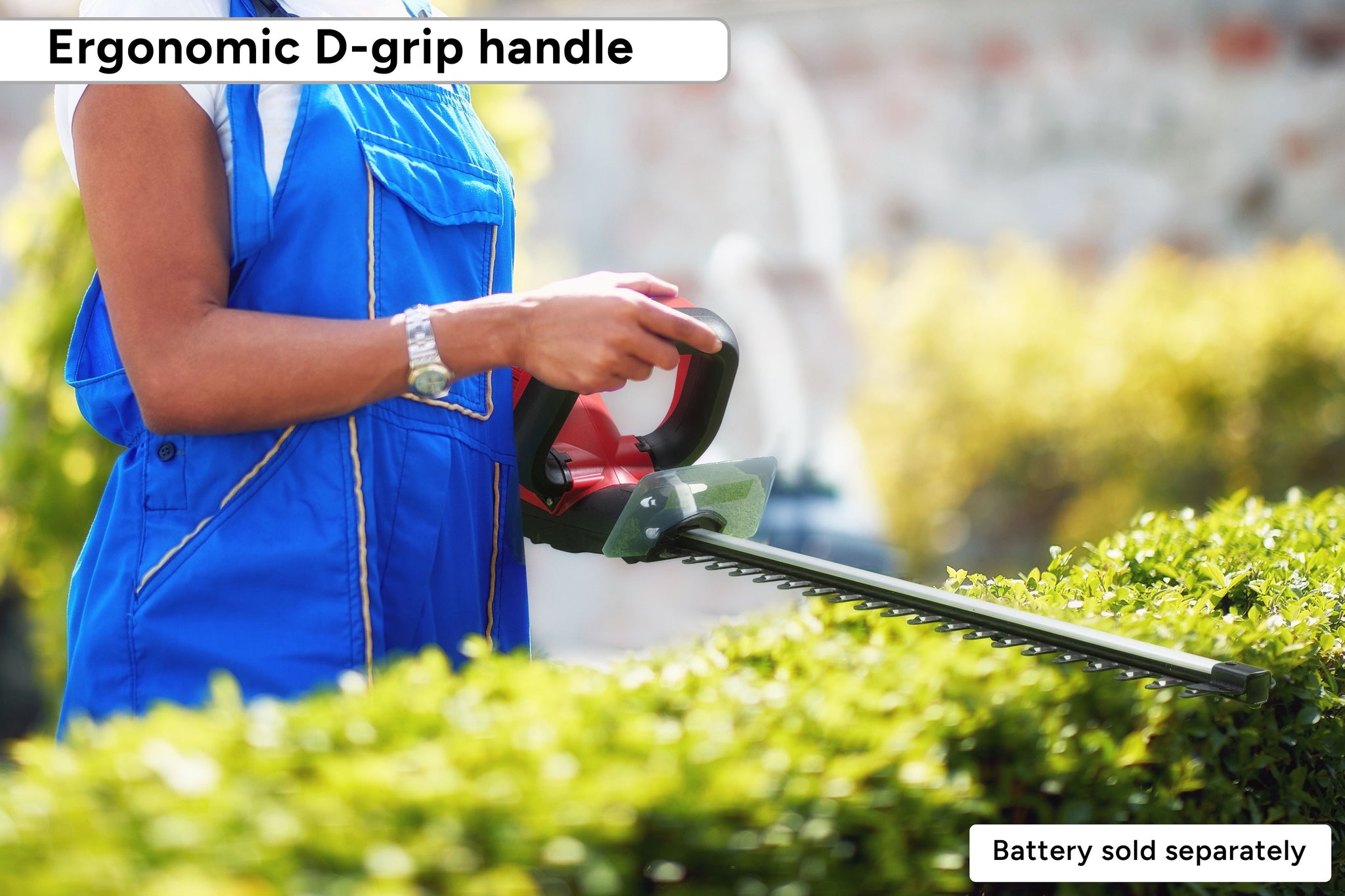p{font-weight:bold;font-size:1.2em}. Experience the power and precision of the Certa™ PowerPlus 20V Hedge Trimmer, designed to ensure your hedges are perfectly manicured while keeping you safe in the process.* *Powerful dual-action blade.* Cuts through small to medium-sized branches with ease.* *No load speed.* Up to 1400RPM for optimal and efficient results.* *Ergonomic design.* Cordless with a D-grip handle for comfortable, long use.* *Safety features.* Dual-switch start and high-quality shell for protection.* *Easy storage.* Comes with a blade cover for safe and convenient storage.p{font-weight:bold;font-size:1.2em}. Powerful dual-action bladeThis 20V hedge trimmer features a 20-inch dual-action blade with a 3/5-inch cutting diameter, making it ideal for cutting through small to medium-sized branches effortlessly. With a no-load speed of up to 1400RPM, this trimmer delivers optimal and efficient results under almost all working conditions. You'll achieve clean and precise cuts every time, making your garden maintenance tasks quick and easy.p{font-weight:bold;font-size:1.2em}. Ergonomic design for maximum comfortDesigned with your comfort in mind, this cordless hedge trimmer maximises your range of motion, allowing you to move freely while working. The ergonomic D-grip handle can be operated from either side, enabling you to work comfortably for long hours. Whether you're trimming high hedges or low shrubs, this hedge trimmer ensures a comfortable and controlled trimming experience.p{font-weight:bold;font-size:1.2em}. Enhanced safety featuresYour safety is the priority with this hedge trimmer. The trimmer only starts running when you press both the front and back switch handles simultaneously, preventing accidental starts. The high-quality shell provides additional protection from the sharp blades, ensuring safe operation. After each use, the hedge trimmer can be stored safely with its included blade cover, giving you peace of mind and prolonging the lifespan of the blades.~Please note: This product does not come with a battery. Compatible with