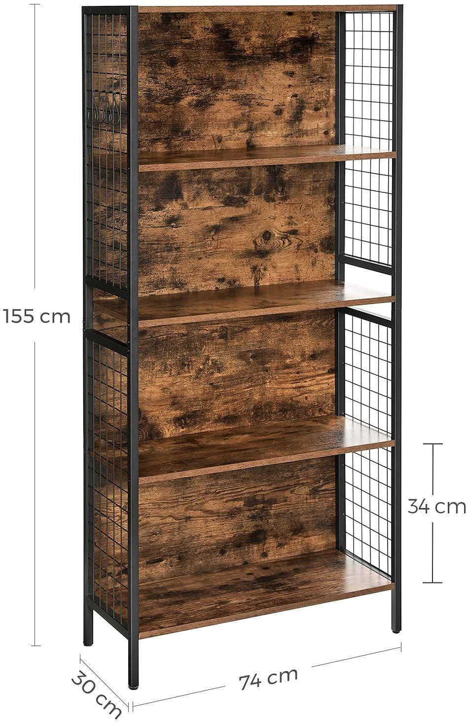 *Jazz up Your Space*Looking for a stunning storage shelf to show your personality? Invite this freestanding shelf featuring rustic brown shelves and a metal frame to your home, it’ll surely make a statement and add a unique touch to your space.*4 Shelves, 4 Hooks*If there's one thing we'll never stop collecting, it's books. From classics to comics, this 4-tier bookshelf offers a perch for all the best literary works. And 4 hooks welcome your earphones and plants to settle down.*Stability Matters*Books are to read, but if you find yourself placing a book under your bookshelf to stabilize it, something is wrong. Luckily, this bookcase comes with 4 adjustable feet so that small dents in the floor can be easily compensated.*Find More*To create a unified, unique look throughout your home, be sure to check our other furniture in VASAGLE’s industrial furniture series. From the entryway to the living room and bathroom, VASAGLE has you covered.*Specifications:** Colour – Rustic Brown + Black* Material – Particleboard, Steel* Product Size – 74 × 30 × 155 cm* Weight – 20.5kg* Max. Static Load Capacity per Tier: 20kg*Package Contents** 1 x Bookcase* 4 x S-Shaped Hook* 1 x Assembly Kit* 1 x Anti-Tip Kit* 1 x Instructions*WARRANTY:*Mighty Ape offers 1 Year Warranty. This warranty covers all manufacturing faults or defects. It does not cover wear, tear, or damage caused by use, accident, or failure to follow care instructions. The warranty is valid for 1 Year from the date of the order and is available to the original purchaser of the product only.*About Vasagle Furniture:*Nice-looking, well-made, and budget-friendly furniture is available for all families. Choose your favorites and reinvigorate your home with ease.