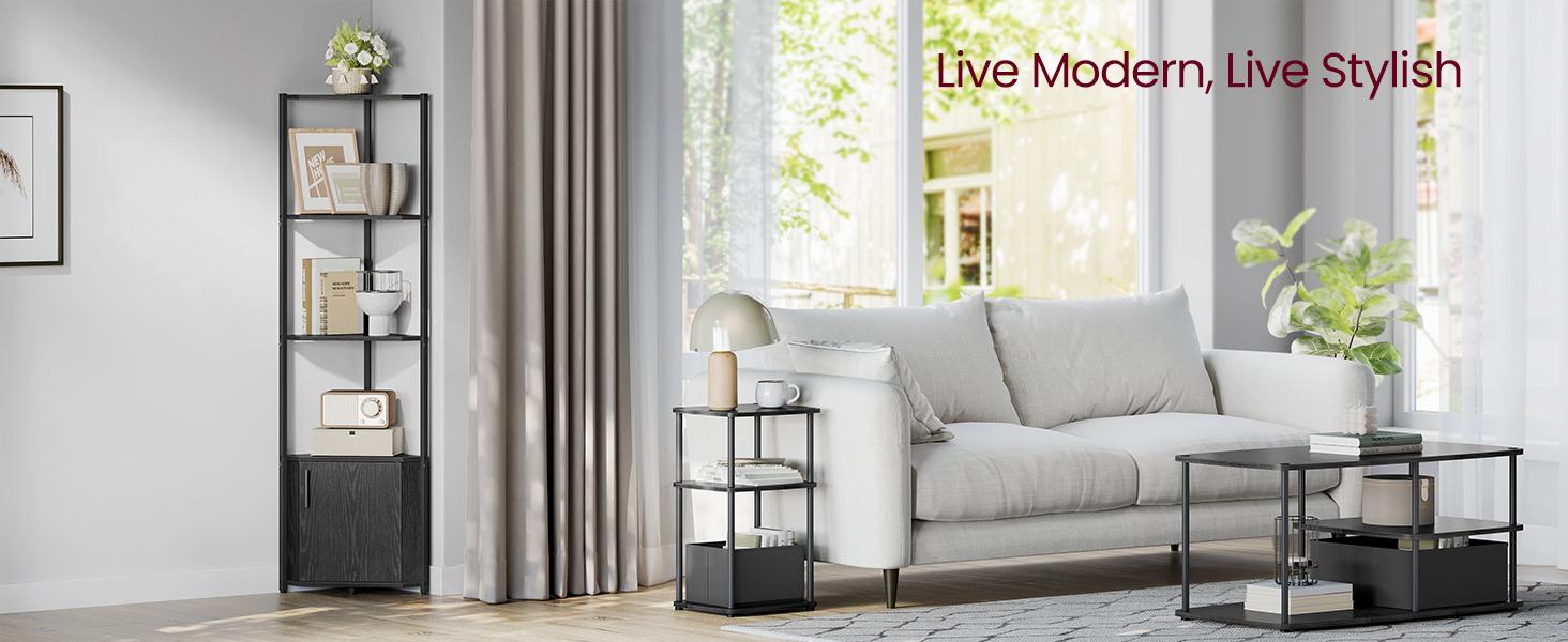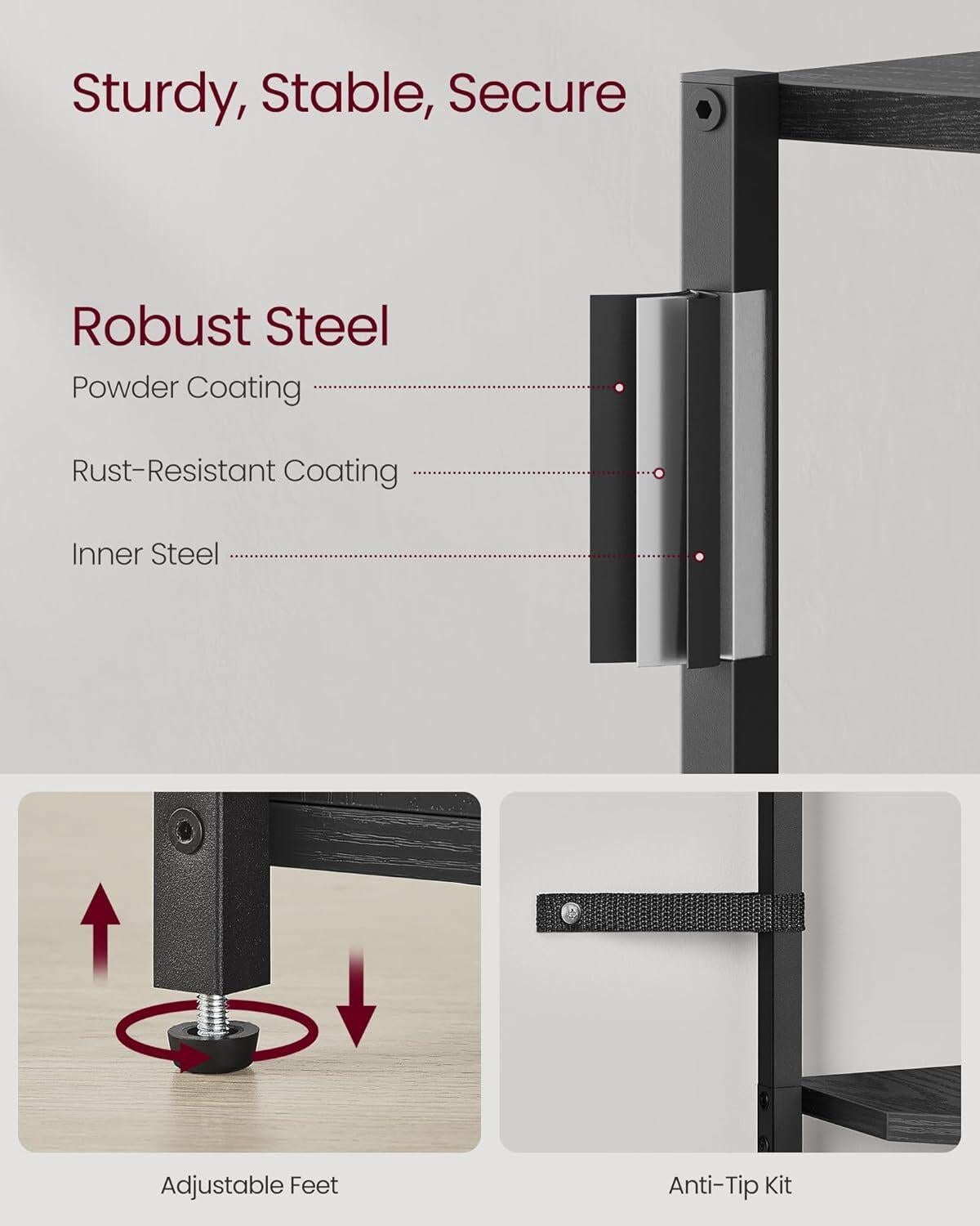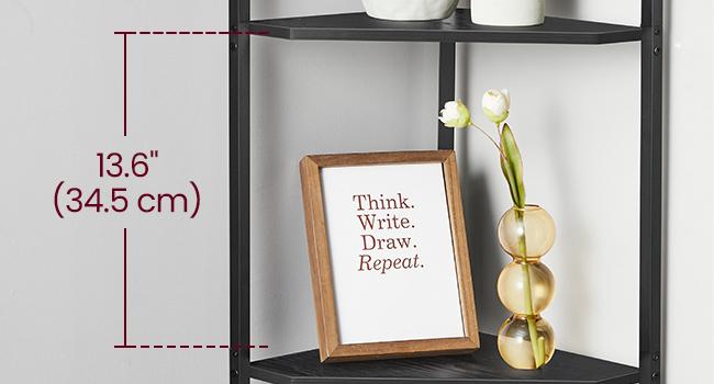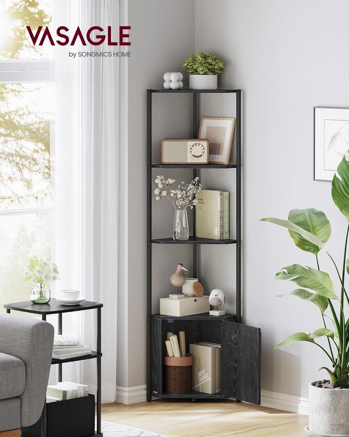 *_VASAGLE 5-Tier Corner Shelf with Storage – Black_*【PLENTY OF STORAGE】The 4 open shelves of this corner cabinet keep books, decorations, and plants organized and within easy reach, while the enclosed cabinet is perfect for personal items【STURDY, STABLE, SECURE】Crafted with premium particleboard and a steel frame, this corner bookshelf boasts a robust construction. Adjustable feet keep it balanced on uneven surfaces, while the anti-tip kit secures it to the wall for safety【VERSATILE CHARM】With its ebony black finish and black frame, this corner storage shelf adds an industrial touch to any space, whether it's your living room, kitchen, dining room, balcony, bathroom, or entryway【SPACE-SAVING】The right-angle design of this corner shelving unit efficiently utilizes corner space, maximizing storage without taking up much room, perfect for small apartments or compact areas【EASY TO ASSEMBLE】Assembly is a breeze with clear instructions and labeled parts. You'll have this corner shelf with storage set up in no time, ready to enhance your space with style and functionalityTired of disorganized corners that waste space? Meet the VASAGLE corner shelf with cabinet, the perfect solution to transform unused corners into stylish storage. It's time to enhance your home decor and maximize your storage potential.*Highlights of This Corner Shelf at a Glance:** Ample Storage: 4 open shelves keep books and decor organized, while the cabinet hides private items.* Sturdy Construction: Premium particleboard and a steel frame provide durability.* Stable and Secure: The adjustable feet and anti-tip kit ensure stability and safety.* Versatile: Perfect for your living room, kitchen, dining room, balcony, bathroom, or entryway.* Space-Saving: The right-angle design fits snugly into corners, optimizing space.* Easy Assembly: Follow clear instructions to assemble labeled parts for quick setup.*Specifications:** Color: Ebony Black, Ink Black* Material: Particleboard, Steel* Product Size: 10"D x 17.5"W x 58"H (25.4 × 44.5 × 147.3 cm)* Product Weight: 14.8 lb (6.7 kg)* Max. Static Load Capacity per Shelf: 48.5 lb (22 kg)* Max. Static Load Capacity of the Cabinet: 35.3 lb (16 kg)* Max. Static Load Capacity in Total: 229.3 lb (104 kg)*Package Contents:** 1 × 5-Tier Corner Shelf* 1 x Accessory Kit* 1 x Anti-Tip Kit* 1 x Instructions*VASAGLE Note:*Please secure the shelf to the wall with the included anti-tip kit to ensure safe use.