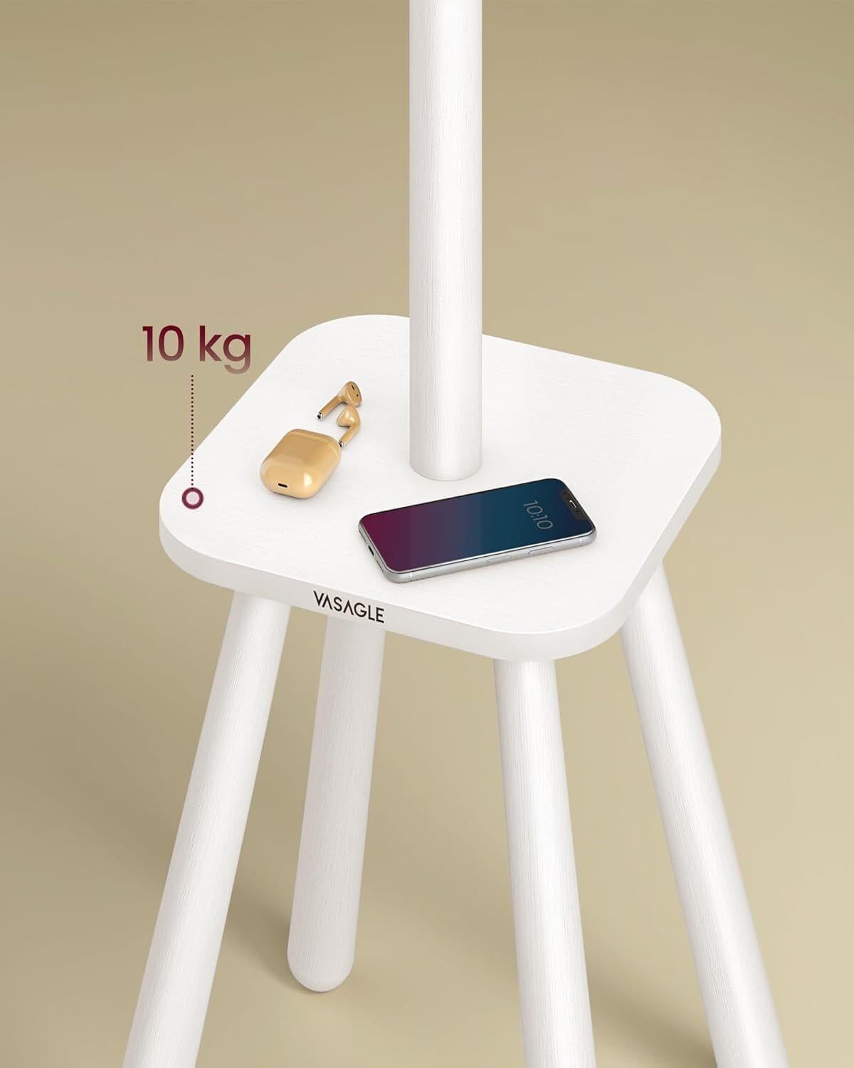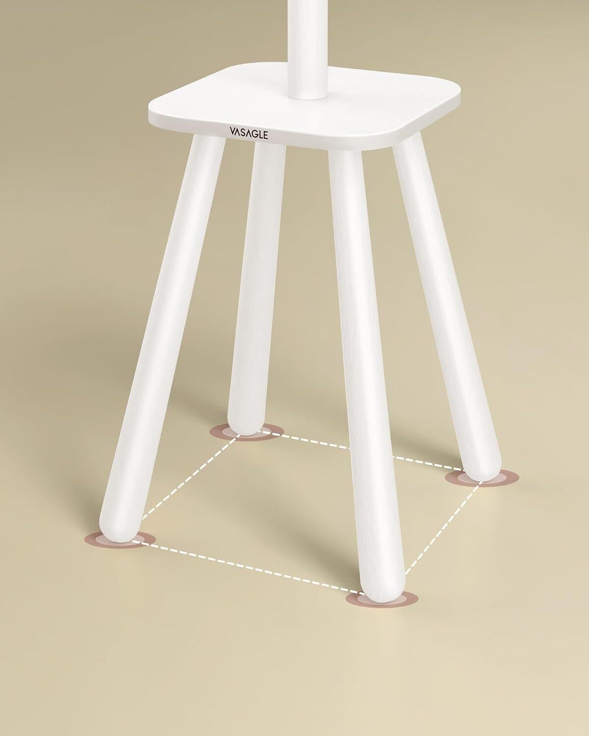 *_VASAGLE Coat Rack with 8 Hooks and Shelf – Cloud White_** *Multifunctional wardrobe stand*Equipped with 8 hooks for coats, hats and bags as well as a shelf for sunglasses, wallets and keys, this clothes rack keeps your most important things in one place and makes your everyday life easier* *Safe, stable and robust*Rounded hooks protect your garments from tears; the 4 legs form a stable base for the stand; each hook supports up to 8 kg, the storage area holds up to 10 kg* *Ideal height*This coat rack is 170.5 cm high, so you can easily reach the items on the top hooks; the shelf is 46 cm above the floor, so you can easily pick up and store your items* *Versatile*This floor-standing coat rack combines functionality and style and brings order to the hallway, bedroom, walk-in wardrobe or even the office* *Easy to assemble*Thanks to the simple structure and clear instructions (English language not guaranteed), this free-standing coat rack can be quickly assembled in a few simple steps*Features**2-in-1 Coat Rack:*This freestanding coat rack combines 8 hooks and 1 shelf, ensuring that coats, jackets, hats, bags, scarves, sunglasses, wallets, and keys are stored in one place and within reach to simplify and organize your daily routine.*High Safety and Stability:*The 8 rounded hooks protect your clothing from tears, while the 4 legs provide a stable and sturdy base. Each hook can hold up to 4 kg, and the shelf supports up to 10 kg, offering a reliable hold for your belongings.*Product Details:** *Color:* Cloud White* *Material:* Rubberwood, MDF (Medium-Density Fiberboard)* *Size:* 34.7 × 34.7 × 170.5 cm (D x W x H)* *Weight:* 3.8 kg* *Max. Static Load Capacity per Hook:* 4 kg* *Max. Static Load Capacity of Shelf:* 10 kg* *Max. Total Static Load Capacity:* 40 kg*Package Includes:** 1 x Coat Rack* 1 x Accessory Kit* 1 x Instruction Manual
