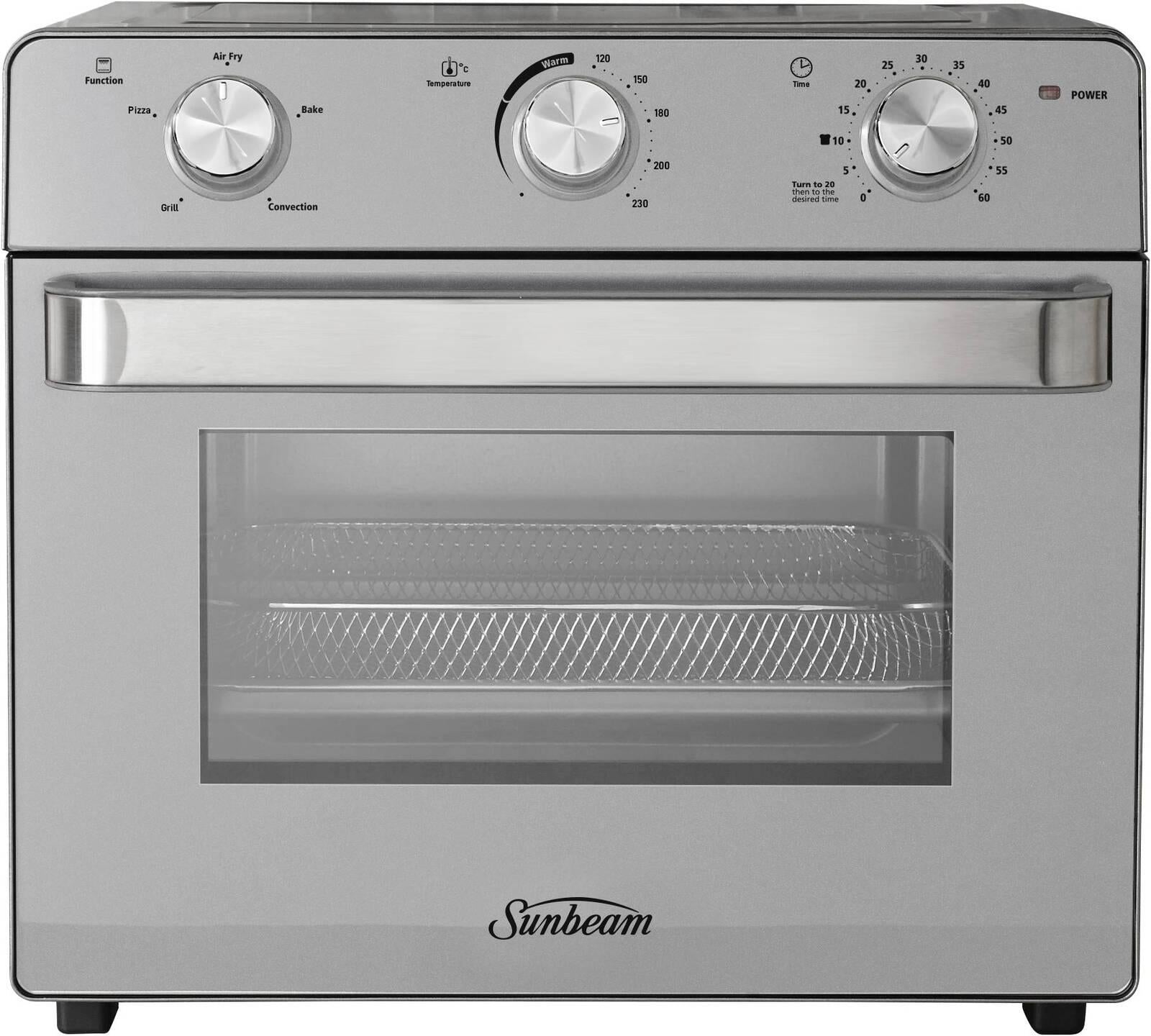 Energy-Efficient Compact Oven and Air Fryer Combo, Cook With 99.6% Less OilEnjoy healthier, faster cooking with the Sunbeam Multi Function Oven + Air Fryer – a versatile appliance that combines the convenience of a compact oven with the benefits of an air fryer. Using up to 99.6% less oil than a traditional 4L Sunbeam deep fryer, you can prepare your favourite meals with less fat and less guilt.*Uses 99.6% Less Oil:* Air Fry Without The Guilt! Uses just 1 tablespoon of oil to cook 1 bag of fries to absolute perfection. Perfect for fries, nuggets, snacks and more.*Turbo Heat Fan Technology:* Delivers convection heating for even cooking and perfectly crisp results.*Perfect For Family Meals:* Fits a 12” pizza, a 2.8kg roast chicken, or a full bag of shoestring fries (750g).*Multiple Cooking Modes:* Bake, convection bake, grill, cook pizza, or air fry—all in one appliance.*Mesh Baket:* Includes a mesh air fryer basket that's easy to use and clean.*Technical Specifications**Materials:* Stainless Steel*Dimensions:* 390 × 280 × 386mm*Capacity / Size:* 22.0L*Wattage:* 1550 – 1850W*Warranty Duration:* 12 Months*Warranty Type:* Replacement*Additional Features:* Adjustable racks – 2 rack positions; adjustable timer up to 60 minutes;*Colour:* Stainless