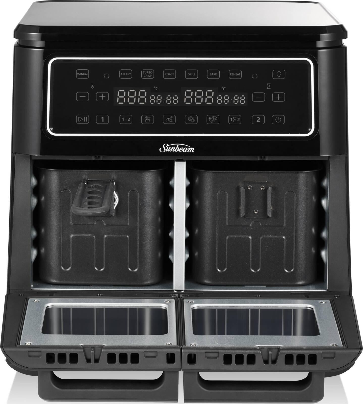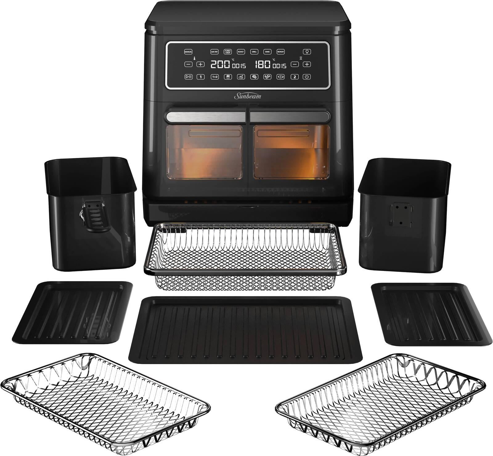 Cook what you want, when you want with the Sunbeam Multi Zone Air Fryer Oven. Featuring an extra large 11.4L single cooking zone that converts to two separate 5.5L cooking zones, get a variety of configurations that offer plenty of space to cook an entire family meal… even a whole roast chicken up to 2.2kg!Clever cooking functions ensure dinner is ready whenever you are: choose Sync to cook 2 dishes, 2 ways, with both finishing at the same time; or select Match to cook food in both zones at the same time and temperature.With 10 cooking presets for chips, chicken, vegetables, steak and more, there's no limitation to what you can make. 1 appliance and 9 accessories allow you to air fry, turbo crisp, bake, grill, roast and reheat – with perfect results every time.Onboard storage and dishwasher-safe accessories make using and caring for this Sunbeam air fryer oven super simple.*Removable Centre Wall:* Easily slide in/out the centre oven wall to divide the cooking zones.*Single or Dual Zone Air Fryer Oven:* Use as an 11.4L single zone or as 2 × 5.5L separate dual zones.*Multiple Ways to Cook:* Comes with an air fry baskets, air fry trays & roasting trays all stored within the air fryer oven.*Accessory Storage Drawer:* On-board storage drawer allows you to store accessories when not in use.*6 Cooking Functions & 4 Presets:* Including Air Fry, Turbo Crisp, Roast, Bake, Grill, Reheat and 4 preset food options to make it even easier to cook your favourites.*Technical Specifications**Materials:* Plastic*Dimensions:* 367 × 360 × 290mm*Capacity / Size:* 11.4L*Wattage:* 2400W*Warranty Duration:* 12 Months*Warranty Type:* Replacement*Cord Length:* 800mm*Temperature:* Up to 230°C*Additional Features:* 2 rack positions; convection oven; internal light; match and sync timers; and dishwasher safe accessories
