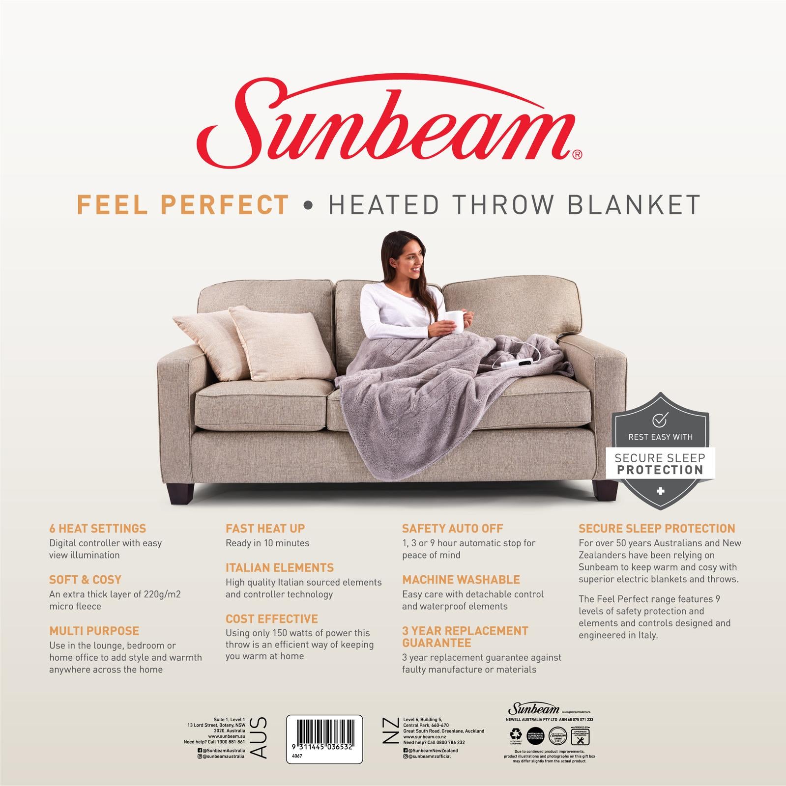 *Sunbeam: Feel Perfect Cosy Sherpa Fleece Heated Throw Rug (Warm Grey)*Keep warm with a cozy sherpa fleece throw wherever you need it around the home. Choose from 6 heat settings with your throw warm and ready within 10 minutes.Quality & Safety Guarantee: The heated throw includes Sunbeam's 9 levels of safety protection, Auto off, and Italian technology & elements; for premium quality.*Feast Heat-Up:*Heat up time takes only ten minutes so you can put your feet up and relax in no time.*Sunbeam's Sleep Perfect Technology:*Sunbeam’s SleepPerfect technology continuously monitors room temperature and body heat and automatically adjusts to maintain your desired temperature.*Plush Sherpa Fleece Material:*This heated throw is made with a delightfully plush 220g/m² sherpa fleece fabric to ensure you’re cosy and comfortable.*Nine Levels of Safety Protection:*To ensure your safety, this heated throw has nine levels of safety features such a built-in microprocessor that detects and prevents overheating.*Measurements/Specifications:** *Width:* 1200mm* *Length:* 1600mm* *Power:* 150 Watts* *Accessories included:* Zip Storage Bag* *Colour:* Grey* *Bedding Size:* Throw* *Machine Washable:* YesWhether it’s relaxing on the couch with your loved ones, or getting a good night’s sleep, this Sunbeam Feel Perfect Sherpa Fleece heated throw will be your most cherished companion.