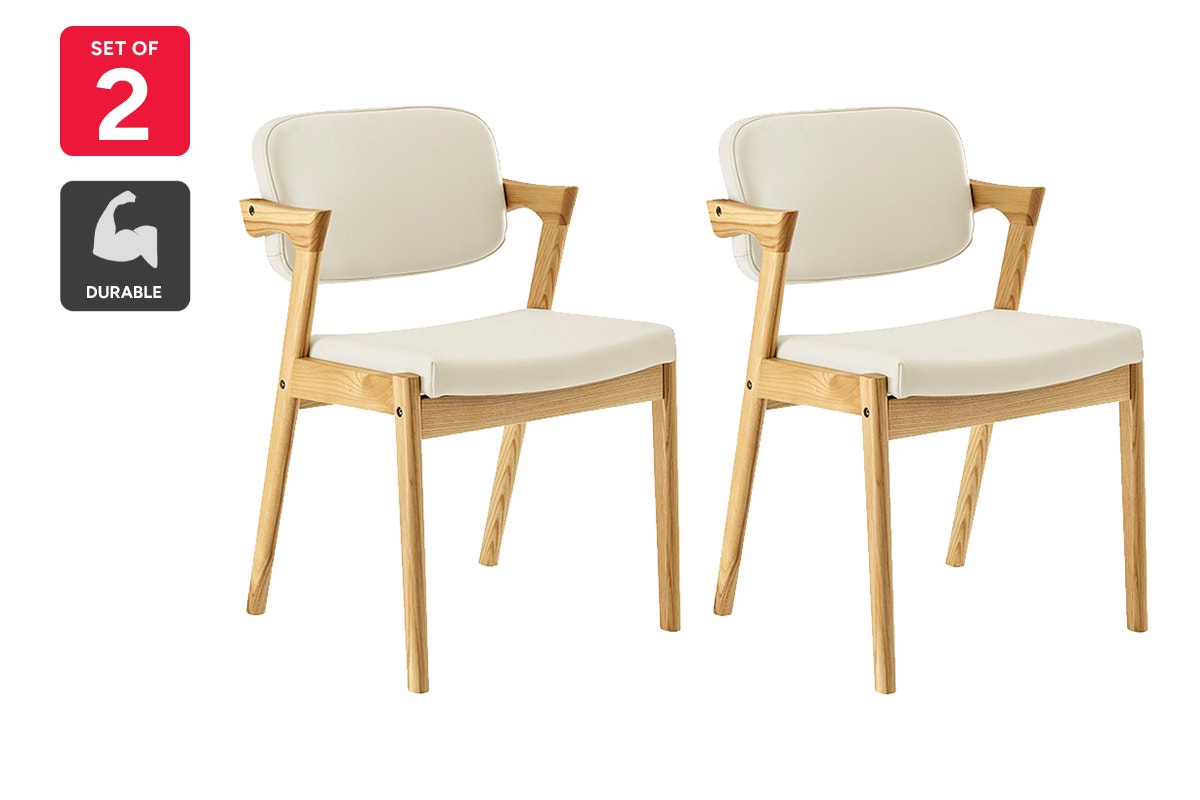p{font-weight:bold;font-size:1.2em}. Elevate your dining space with these elegant Kai Replica Danish Dining Chairs. Featuring a striking Z-shape armrest design, ash wood frame and PU faux leather cushions, these chairs offer a blend of style, comfort and durability.* *Stylish Z-shape armrest.* Enhances your dining area’s aesthetic.* *Ash wood frame.* Durable yet lightweight, adapts to various interior styles.* *PU faux leather cushions.* Water-resistant, easy to clean and long-lasting.* *Ergonomic backrest.* Slight tilt ensures optimal comfort.* *Kai Kristiansen replica.* Inspired by the iconic Chair No 42.p{font-weight:bold;font-size:1.2em}. Elegant Z-shaped armrest designThe Kai Replica chairs feature a signature Z-shaped armrest that instantly adds a sophisticated touch to your dining area. Whether your style is modern, mid-century or Scandinavian, these chairs effortlessly blend in while adding a designer edge to your space.p{font-weight:bold;font-size:1.2em}. Crafted for durability and ideal ergonomicsMade from high-quality ash wood, these chairs offer the strength of oak while remaining lightweight. The PU faux leather cushions are designed for easy maintenance, making them water-resistant and simple to wipe clean, perfect for everyday use. Additionally, the backrest is slightly tilted for ergonomic support, ensuring comfort during long meals.p{font-weight:bold;font-size:1.2em}. Inspired by an iconic designInspired by Kai Kristiansen’s renowned Chair No 42, these dining chairs bring timeless Danish design into your home. Their stylish form and functionality are ideal for both formal dining spaces and casual kitchen setups, providing an elegant solution for any interior.
