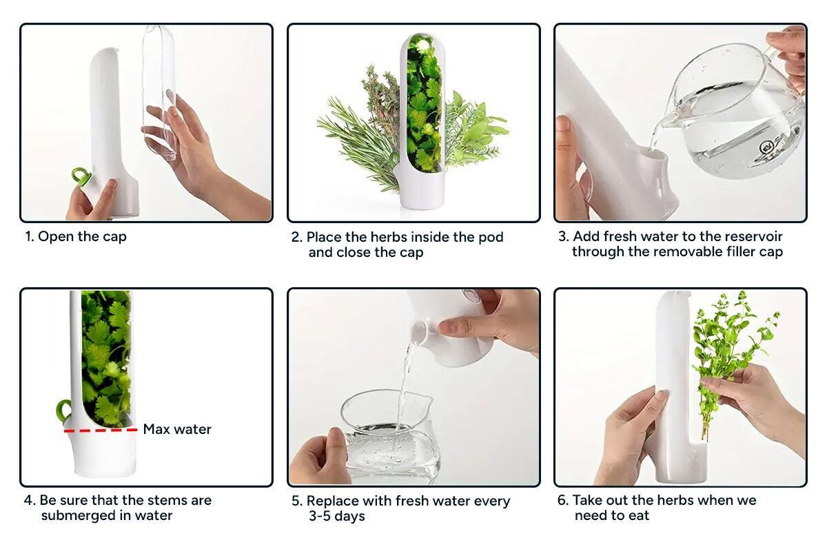 Say goodbye to wilted coriander and soggy basil. These sleek Herb Preservation Pods keep your herbs and veggies fresh for up to three weeks by maintaining the ideal humidity inside your fridge. Just add water, pop in your produce, and enjoy garden-fresh flavour every time.* Keeps herbs fresh for up to three weeks. Lock in flavour and reduce food waste.* Built-in water reservoir. Maintains optimal humidity for longer-lasting freshness.* Easy to use. Simply add water, insert herbs and close the lid.* Space-saving design. Slim profile fits neatly in your fridge door or shelf.* BPA free. Made with food-safe, non-toxic materials.* Dishwasher safe. Easy cleaning and hassle-free maintenance.* 4 pack. Perfect for storing a variety of herbs and vegetables at once.Longer life for your leafy greensTired of throwing out herbs after just a few days? These pods help extend the life of your herbs and delicate veggies by maintaining the perfect humidity. Less wilt, more flavour—and fewer trips to the shops. Whether it’s basil or mint, asparagus or celery, these pods will preserve them longer.Smart design, easy storageDesigned to slip easily into most fridge doors or shelves, these pods won’t crowd your space. The clear cover makes it easy to see what’s inside, while the upright design keeps stems submerged and leaves dry.Freshness made simpleNo fancy tech or complicated steps – just add water to the base, insert your herbs, and you’re done. The built-in reservoir helps keep the internal environment just right, so your herbs stay crisp, vibrant and ready to use.Safe and sustainableMade from BPA-free materials, these pods are reusable, easy to clean, and a great way to cut down on plastic bags and wasted produce. Fresh herbs, the better way.