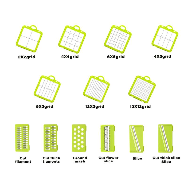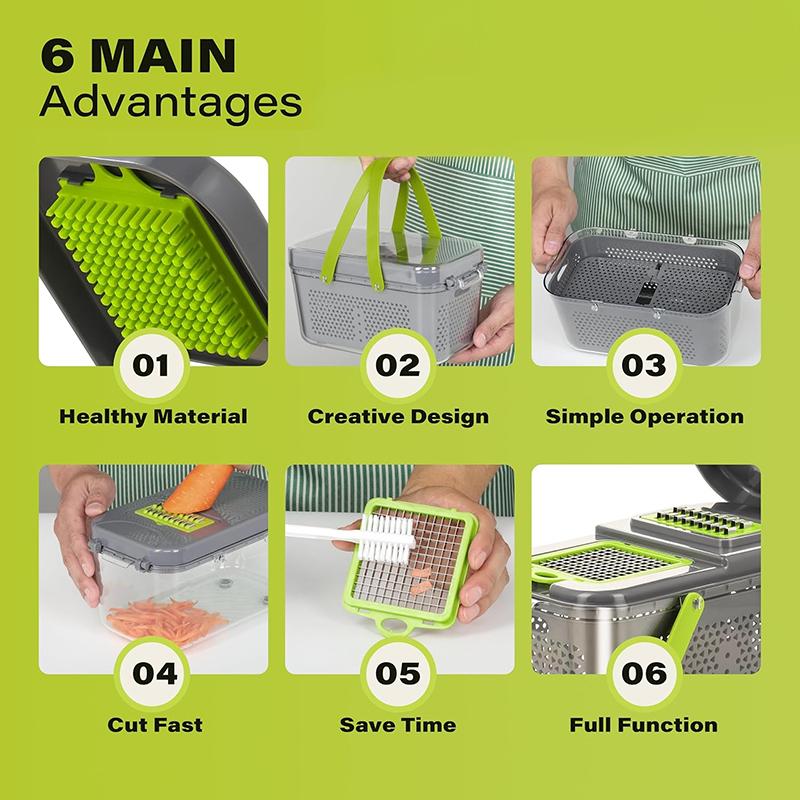 *_OZZYCOOK 22 in 1 Vegetable Cutter with Container_**_Upgrade your kitchen arsenal_*A versatile and time-saving tool designed to streamline your food preparation process. With 13 interchangeable blades, this multifunctional vegetable cutter offers a comprehensive range of cutting options, from chopping and shredding to slicing and garnishing, effortlessly catering to various culinary needs.*_Save precious cooking time_*With this vegetable chopper's efficient chopping mechanism. Its sharp and durable 420-grade hardened stainless steel blades ensure smooth cutting and effortless handling of diverse ingredients. Crafted from high-quality PP+ABS plastic, this vegetable slicer is built to last, enduring regular use in the kitchen with ease.*_Designed for convenience and portability_*This veggie chopper features intelligent compartments that can be folded to save space, facilitating effortless storage. The large-capacity container at the bottom of the chopper includes a water filter basket, simplifying the rinsing and draining of vegetables and fruits, further streamlining your food preparation process.*_13 Interchangeable Blades:_*Offers a comprehensive range of cutting options, including chopping, shredding, slicing, and garnishing, for versatile food preparation.*_Efficient Chopping Mechanism:_*Sharp and durable 420-grade hardened stainless steel blades ensure smooth cutting and effortless handling of diverse ingredients.*_Durable Construction:_*Crafted from high-quality PP+ABS plastic, built to last and withstand regular use in the kitchen.*_Space-Saving Design:_*Clever compartments can be folded for easy storage, enhancing portability and convenience.*_Large-Capacity Container:_*Includes a water filter basket for easy rinsing and draining of vegetables and fruits, simplifying the food preparation process.*Technical Specifications**_Colour:_* Grey*_Material:_* Stainless Steel, Plastic*_Size:_* 24×14×14.5cm*_Weight:_* 1.2kg*_Package Contents:_*1× OZZYCOOK Vegetable Cutter with Container7× Dicer Blades2× Slicer Blades2× Shred Blades1× Detachable Vegetable Chopper1× Cut Flower Blade1× Mince Ginger Ground Blade1× Egg White Separator1× Blade Storage Box1× Hand Guard1× Paring Knife1× Container with Lid1× Draining Basket1× Cleaning Fork1× Cleaning Brush4× Non-slip Mats1× User Manual